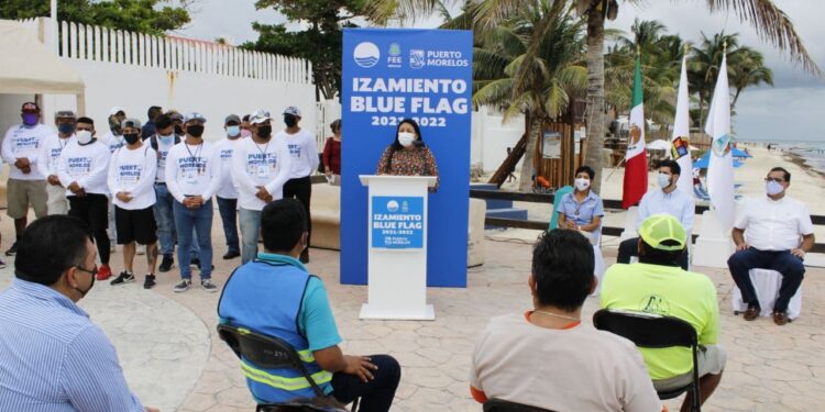 Puerto Morelos, Quintana Roo, 18 de noviembre de 2021.- La alcaldesa Blanca Merari Tziu Muñoz encabezó esta tarde el izamiento del estandarte “Blue Flag” en la playa de la Ventana al Mar, para el periodo 2021-2022, marco en el que destacó que este distintivo representa un reto permanente para el municipio, ya que se debe incrementar la calidad con la que se recibe a los ...