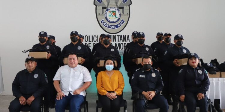 Puerto Morelos, Quintana Roo, 6 de julio de 2022.- Con el objetivo de fortalecer y dignificar la labor de la Policía de Puerto Morelos, la alcaldesa Blanca Merari Tziu Muñoz entregó hoy uniformes a los elementos de la corporación, en evento que tuvo lugar en las instalaciones de la Secretaría municipal de Seguridad Pública y Tránsito. Acompañada por el titular de la dependencia, Alfredo Edgardo ...