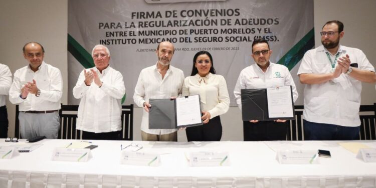 Puerto Morelos, Quintana Roo, 9 de febrero de 2023.— El gobierno de la alcaldesa Blanca Merari Tziu Muñoz y el Instituto Mexicano del Seguro Social (IMSS) firmaron hoy dos convenios, con los que se liquidarán 80 millones 716 mil pesos correspondientes a adeudos heredados de la anterior administración municipal, que descontó a los trabajadores del Ayuntamiento sus cuotas obrero-patronales en 2020 y 2021 pero omitió ...