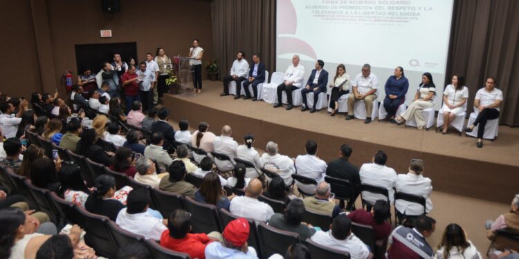 Cancún, Quintana Roo, a 21 de febrero de 2024.— El gobierno de Puerto Morelos atestiguó la firma del Acuerdo Solidario de Promoción del Respeto y Tolerancia a la Libertad Religiosa, entre la gobernadora Mara Lezama y ministros de los diversos cultos religiosos en el Estado. En el marco del evento, que se llevó a cabo en el auditorio del Planetario de esta ciudad, la alcaldesa ...