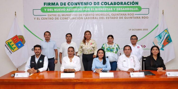 Puerto Morelos, Quintana Roo, 18 de octubre de 2025.—Al suscribir hoy el Convenio de Colaboración con el Centro de Conciliación Laboral de Quintana Roo y el Acuerdo para el Bienestar y Desarrollo, la presidenta municipal Blanca Merari Tziu Muñoz afirmó que su administración siempre defenderá los derechos de quienes colaboran en su administración, pero también les pedirá permanentemente su compromiso para hacer mejor las cosas. ...