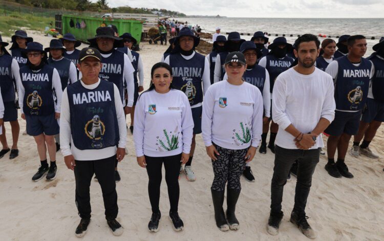 Puerto Morelos, Quintana Roo, 25 de julio de 2025.— La presidenta municipal Blanca Merari Tziu Muñoz agradeció esta mañana la participación de poco más de 70 colaboradores del Ayuntamiento y 30 elementos de la Marina-Armada de México en una nueva jornada del programa “Todos contra el sargazo”.