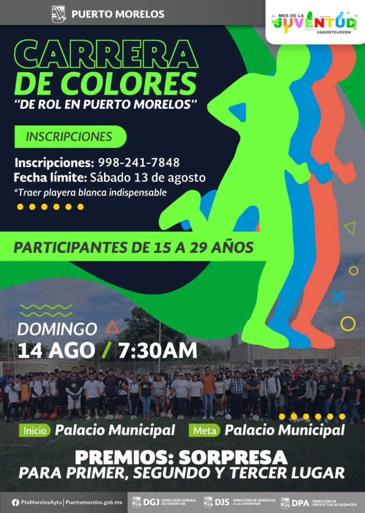 Puerto Morelos, Quintana Roo, 9 de agosto de 2022.- Como parte de las actividades del Mes de la Juventud, el gobierno de la presidenta municipal Blanca Merari Tziu Muñoz anunció la Carrera de Colores, “De rol en Puerto Morelos”, que se llevará a cabo el próximo domingo a partir de las 7:30 de la mañana.