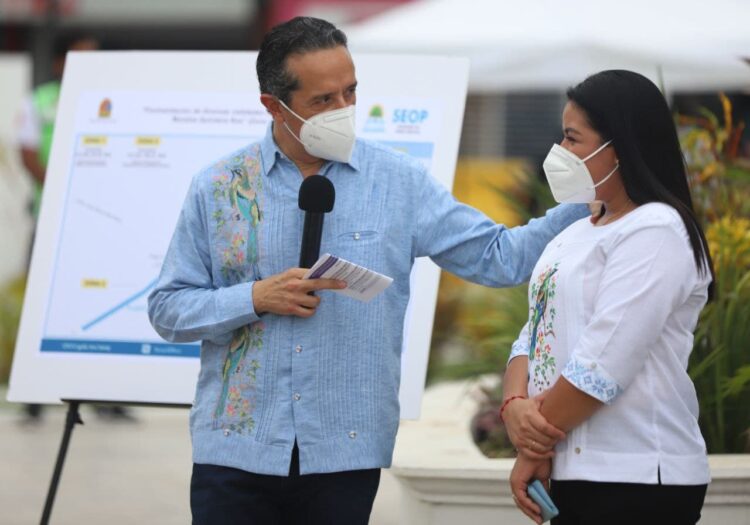 Anuncian el Gobernador y la presidenta Blanca Merari Tziu Muñoz obra de pavimentación en Puerto Morelos