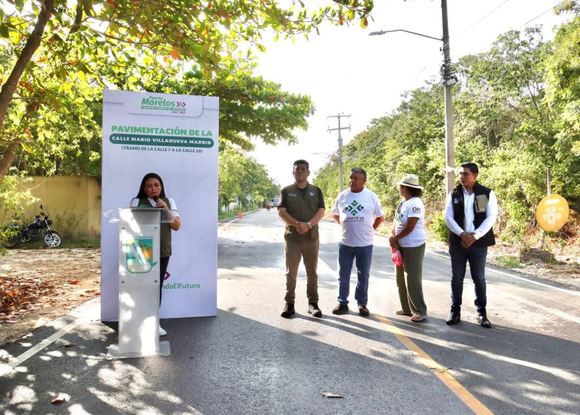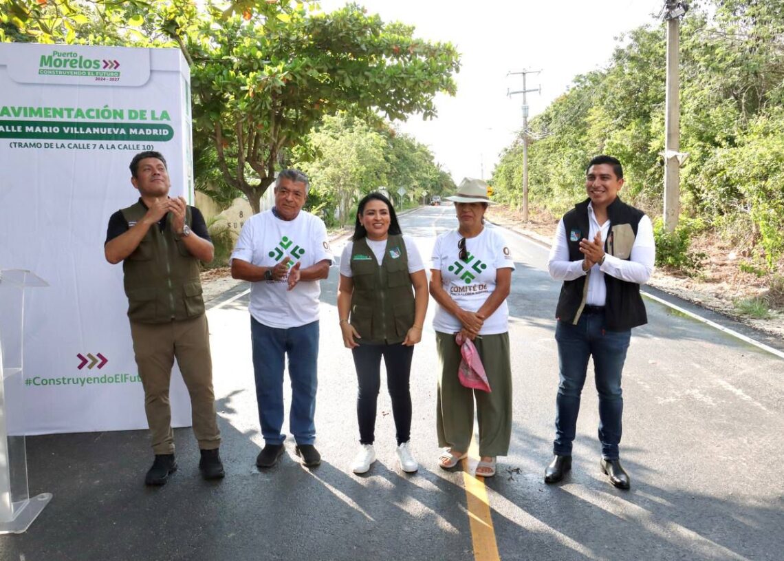 Puerto Morelos, Quintana Roo, 30 de septiembre de 2025.– La presidenta municipal Blanca Merari Tziu Muñoz, en cumplimiento del Plan de Obras 2025, inauguró la pavimentación de la calle Mario Villanueva Madrid en el tramo comprendido entre las calles 7 y 10 de la zona urbana.