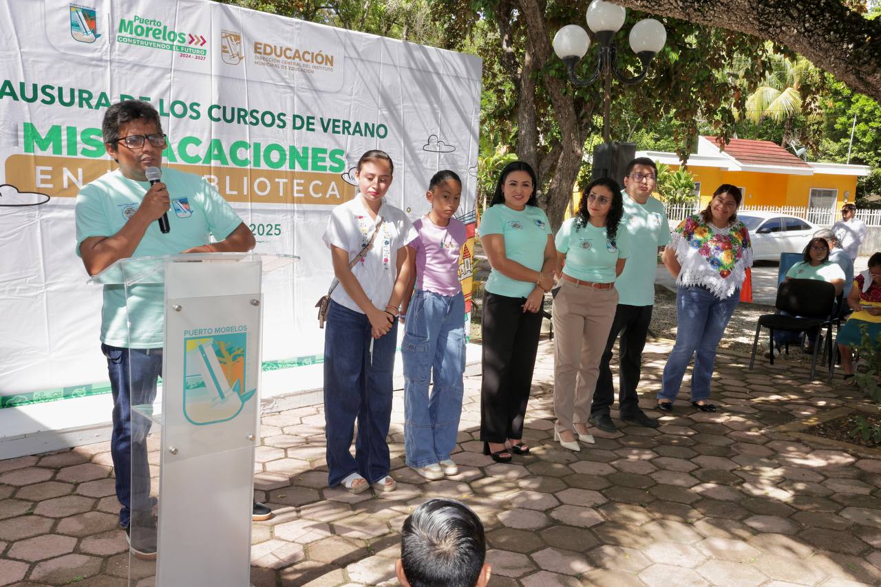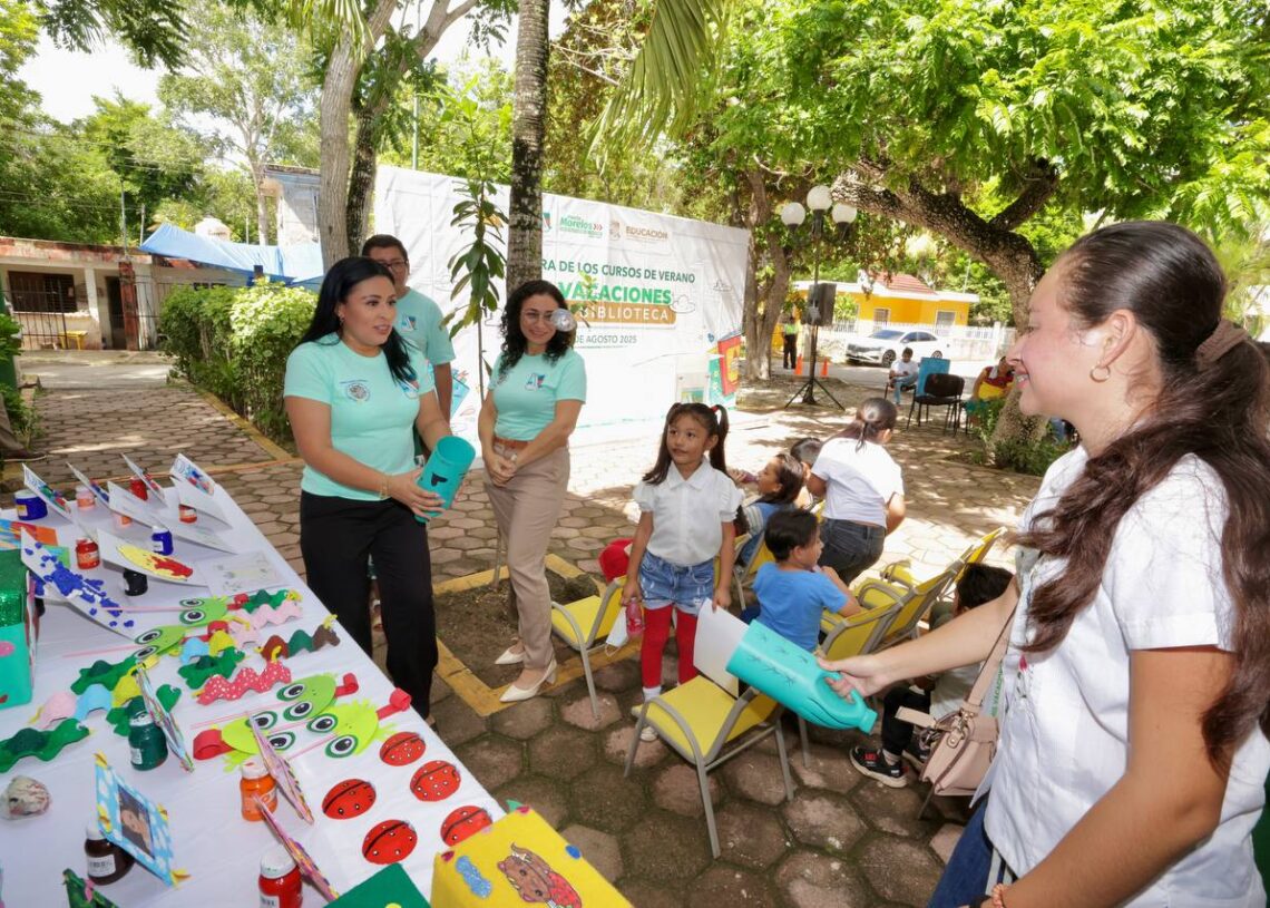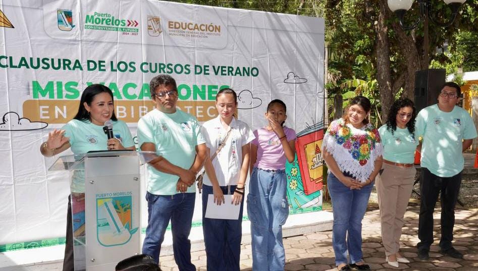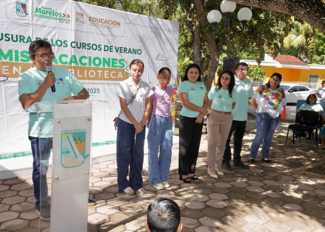 Leona Vicario, Puerto Morelos, Quintana Roo, 9 de agosto de 2025.– La presidenta municipal Blanca Merari Tziu Muñoz clausuró el curso de verano “Mis vacaciones en la biblioteca”, que se impartió en esta Delegación y en la cabecera municipal.