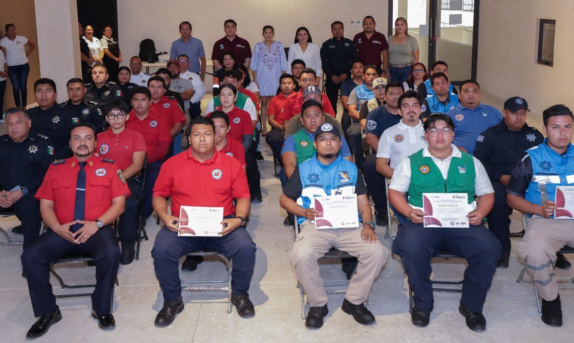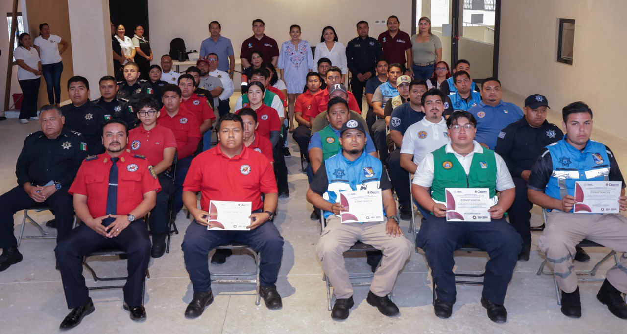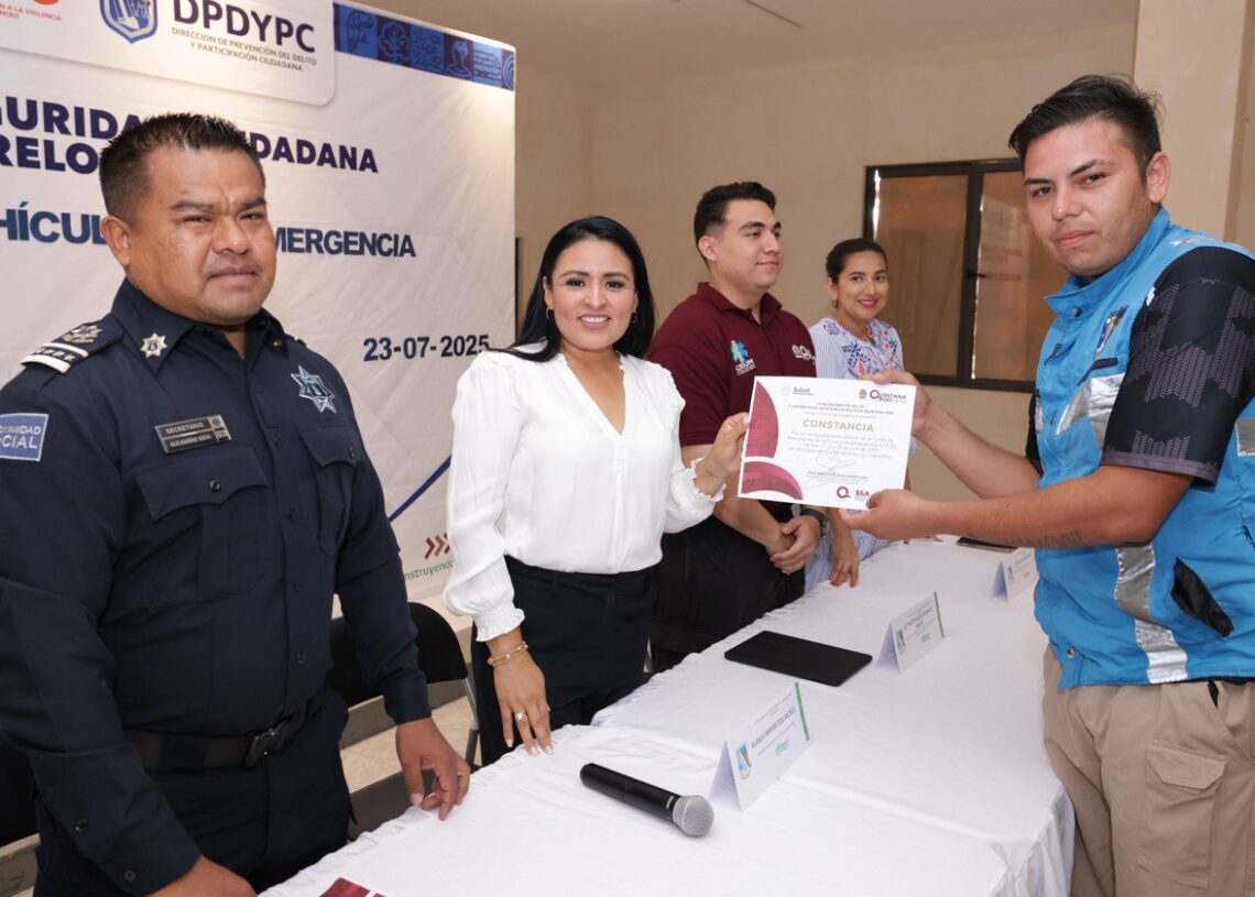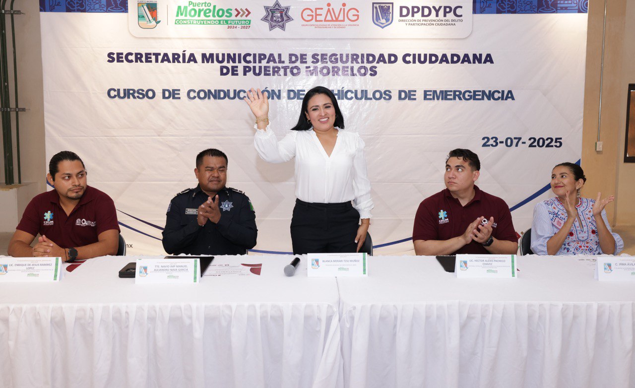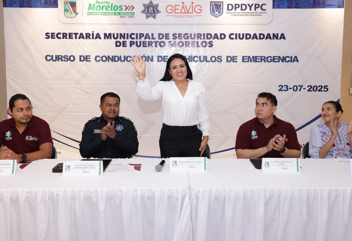 Puerto Morelos, Quintana Roo, 23 de julio.- “La capacitación, sin duda, es lo que nos permite ser mejores servidores públicos y para eso cuenten con nosotros”, dijo hoy la presidenta municipal Blanca Merari Tziu Muñoz, al clausurar el Curso de Conducción de Vehículos de Emergencia, impartido por instructores de la Secretaría Estatal de Salud (Sesa).