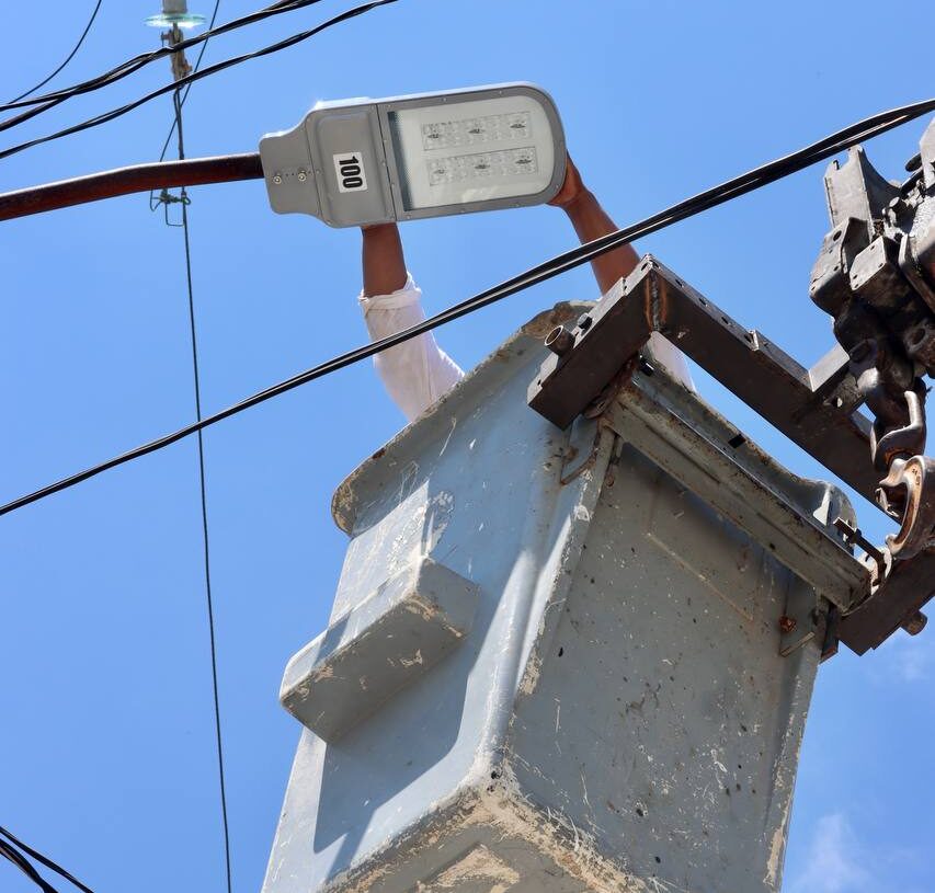 Puerto Morelos, Quintana Roo, 20 de septiembre de 2023.— Conforme a lo anunciado por la presidenta municipal Blanca Merari Tziu Muñoz en su II Informe de Gobierno, personal de la Dirección General de Servicios Públicos continúa la renovación de la red de alumbrado público de Puerto Morelos, en la que se contempla la instalación de 629 luminarias tipo led.