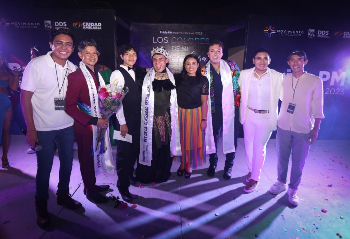 Puerto Morelos, Quintana Roo, 18 de junio de 2023.- La presidenta municipal Blanca Merari Tziu Muñoz coronó al Rey de la Diversidad Sexual 2023 de Puerto Morelos, Yushua Martín Basto, durante el evento PRIDE PM que se llevó a cabo en el parque principal de la colonia Joaquín Zetina Gasca, donde se dieron cita más de 200 personas para apoyar a los candidatos, quienes mostraron en todo momento su talento en el baile, la música y la poesía, además de la creación de vistosos atuendos.