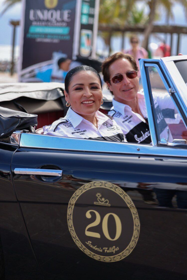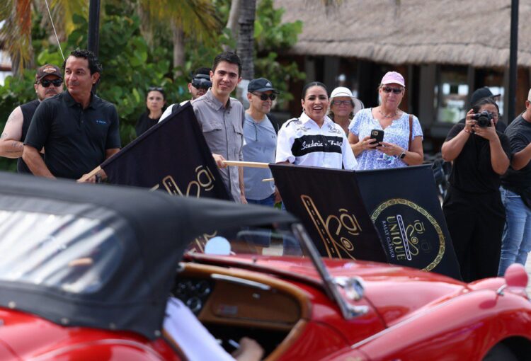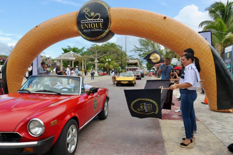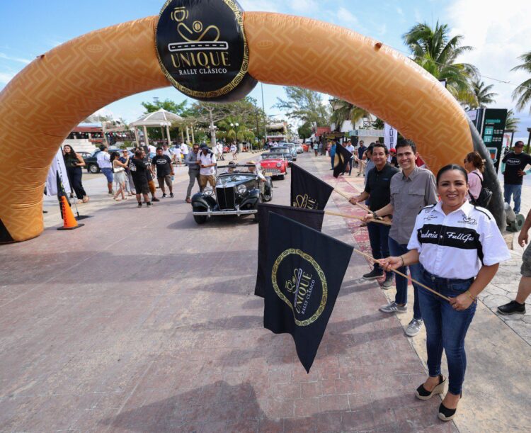 Puerto Morelos, Quintana Roo, 18 de septiembre de 2025.– La presidenta municipal Blanca Merari Tziu Muñoz dio hoy el banderazo de salida a los 30 autos, modelos de los años 50, 60 y 70, participantes en el Unique Rally Clásico, que emprendieron desde la Ventana al Mar del Casco Antiguo un recorrido de 600 km por carreteras de Quintana Roo y Yucatán.