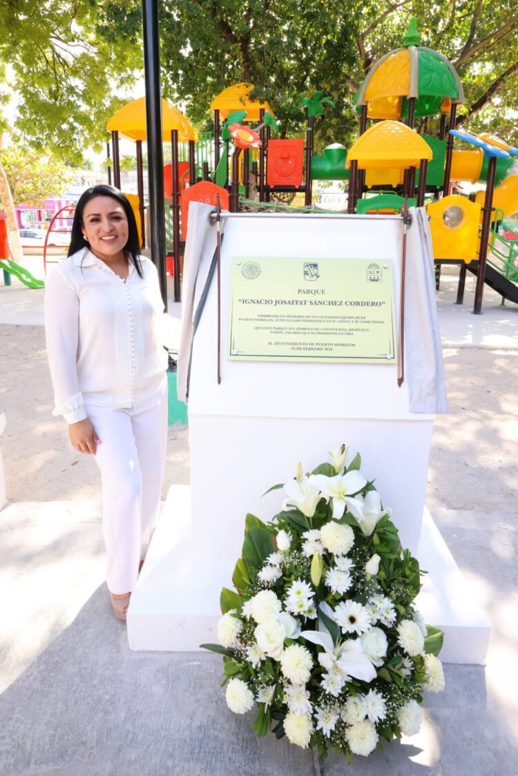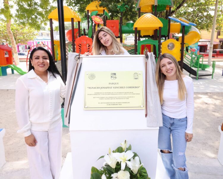 Puerto Morelos, Quintana Roo a 24 de febrero de 2026.— En un acto lleno de emotividad y reconocimiento, la presidenta municipal, Blanca Merari Tziu Muñoz, encabezó la develación de la placa de nombramiento del Parque Ignacio Josaffat Sánchez Cordero, un espacio creado para la recreación y la convivencia familiar, que a partir de hoy lleva el nombre de un hombre recordado por su pasión de servicio a la comunidad.