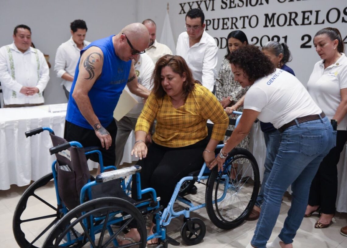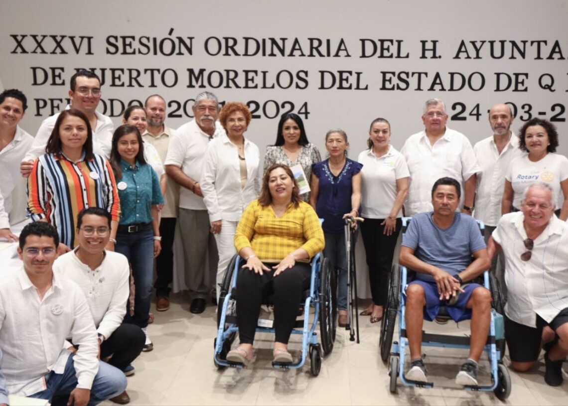 Puerto Morelos, Quintana Roo, 24 de marzo de 2023.- El gobierno que encabeza la presidenta municipal Blanca Merari Tziu Muñoz fortalece las relaciones con organismos e instituciones de apoyo social, como el Club Rotario de Puerto Morelos, que hizo entrega de 2 sillas de ruedas y bastones al Sistema para el Desarrollo Integral de la Familia (DIF), en el marco de su aniversario número 10 de establecerse en la demarcación.