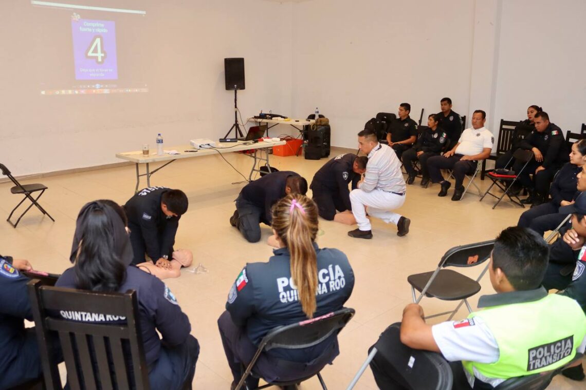 Puerto Morelos, Quintana Roo, 13 de diciembre de 2023.- Más de 40 elementos de la Secretaría municipal de Seguridad Pública y Tránsito tomaron un curso de primeros auxilios, que se llevó a cabo en la Sala de Cabildo, con el objetivo de reforzar sus conocimientos y poder actuar ante cualquier situación de emergencia que pudiera registrarse a lo largo del periodo vacacional de invierno.