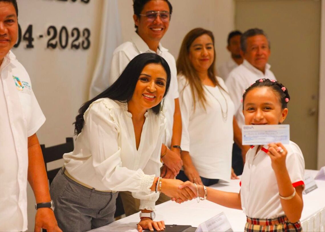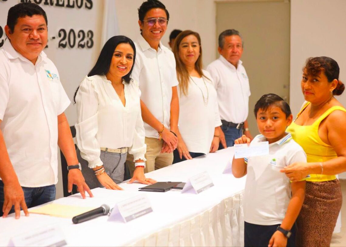 En el evento, realizado en el Salón de Cabildo “José María Morelos”, Blanca Merari Tziu entregó de manera simbólica los cheques correspondientes a los niños Georgina Casanova, Jesús Gael López, Oscar Isaac Savillón, Mónica Itzel Domínguez y Shecid Philane Tun Tzab.