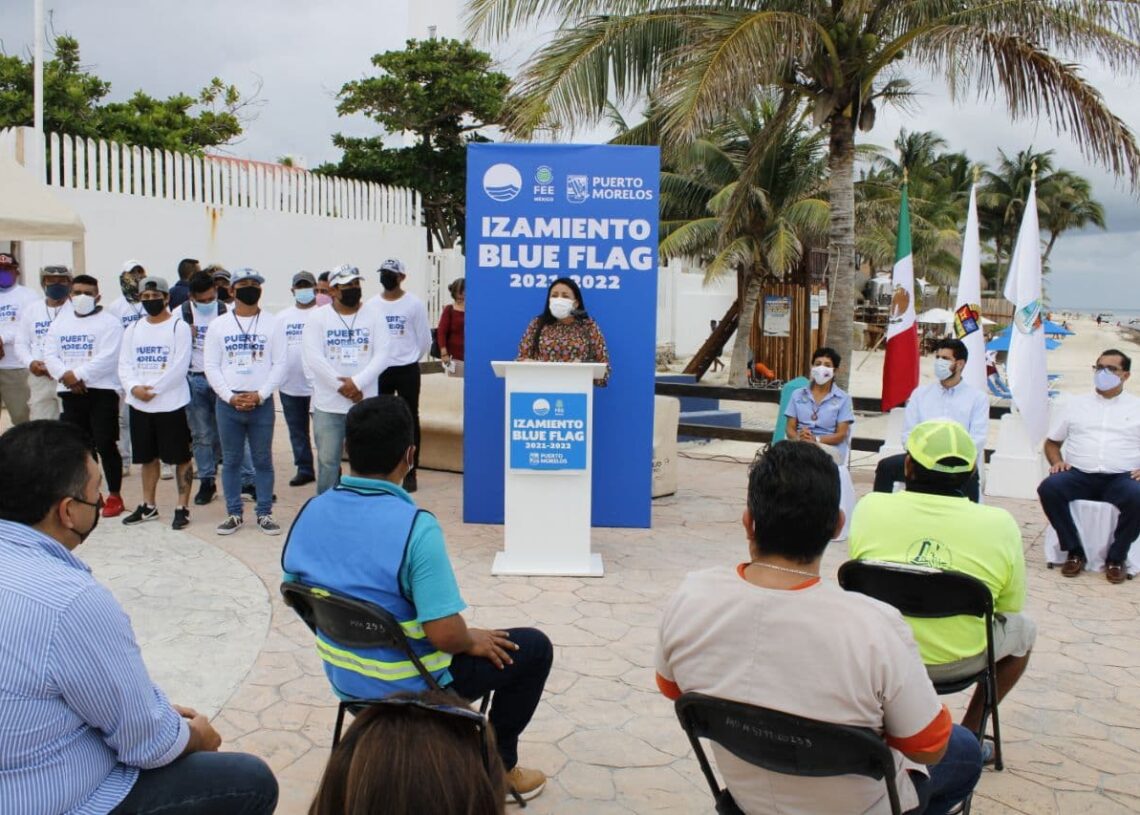 Puerto Morelos, Quintana Roo, 18 de noviembre de 2021.- La alcaldesa Blanca Merari Tziu Muñoz encabezó esta tarde el izamiento del estandarte “Blue Flag” en la playa de la Ventana al Mar, para el periodo 2021-2022, marco en el que destacó que este distintivo representa un reto permanente para el municipio, ya que se debe incrementar la calidad con la que se recibe a los turistas y conservar el entorno para los portomorelenses.