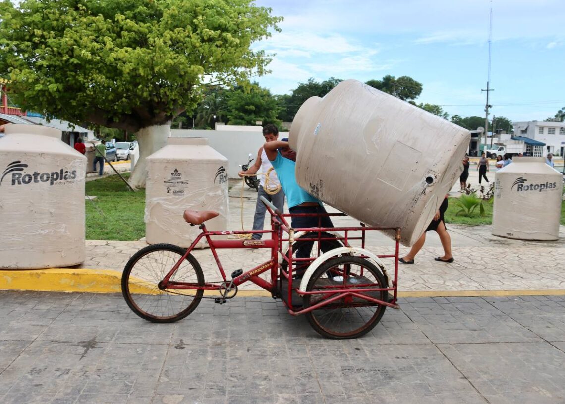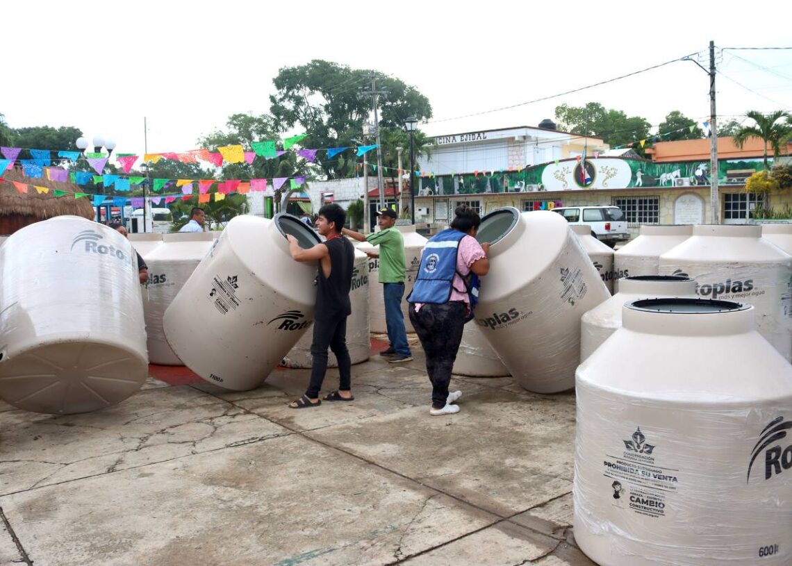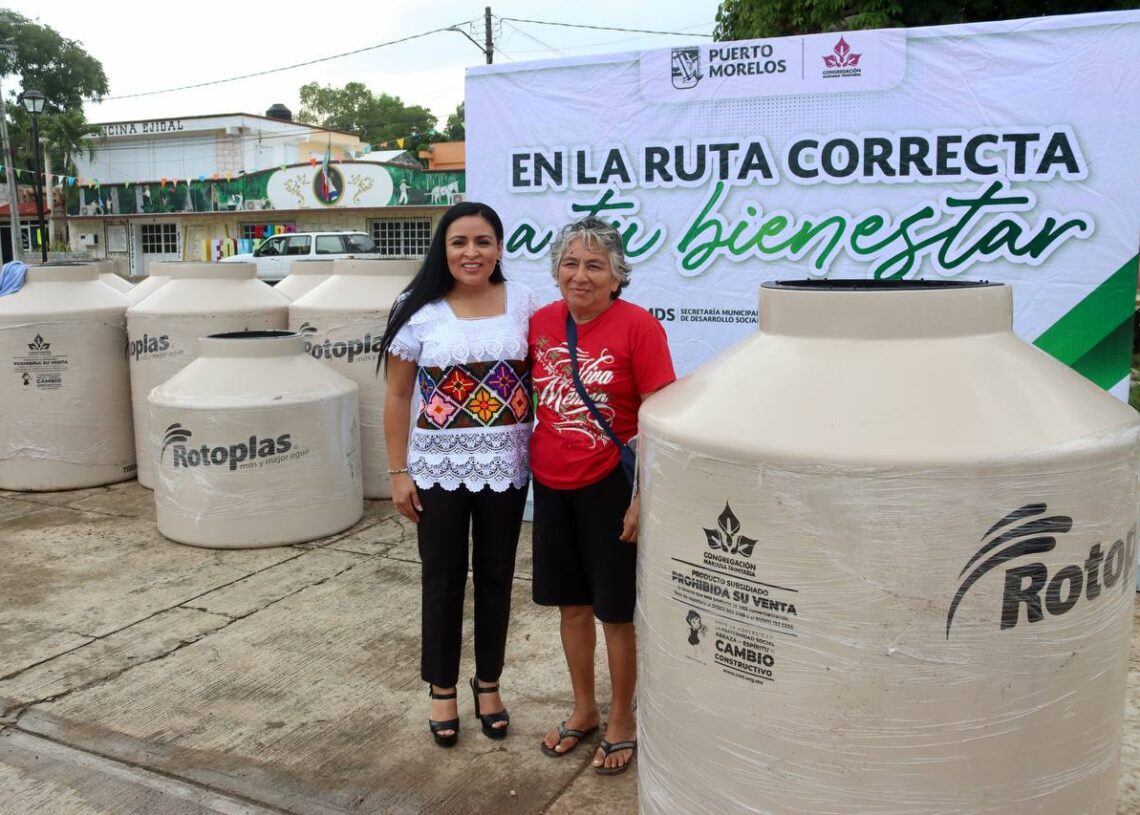 Leona Vicario, Puerto Morelos, Quintana Roo, 24 de agosto de 2023.— A un año de que la presidenta municipal Blanca Merari Tziu Muñoz firmó un convenio con la Congregación María Trinitaria con el objetivo de llevar bienestar a familias en condición de vulnerabilidad del municipio, hoy entregó en esta delegación 34 tinacos de diferente capacidad.