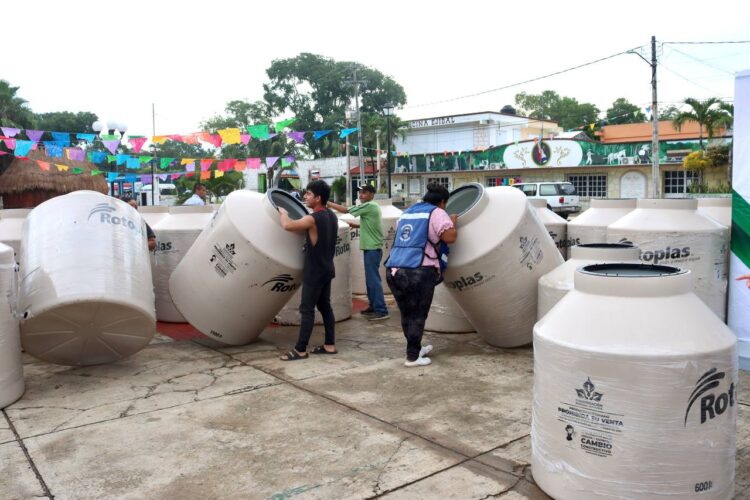 Por su parte, Kenia Franco Cox, directora de Programas Federales, confirmó que en esta ocasión fueron entregados 34 tinacos de 2,500, 1,100, 750 y 600 litros de capacidad. “Esta fue la séptima entrega desde la firma del convenio y la tercera de este año, pues anteriormente se distribuyeron 360 sacos de cementos en Leona Vicario y 21 tinacos en Puerto Morelos”, manifestó.