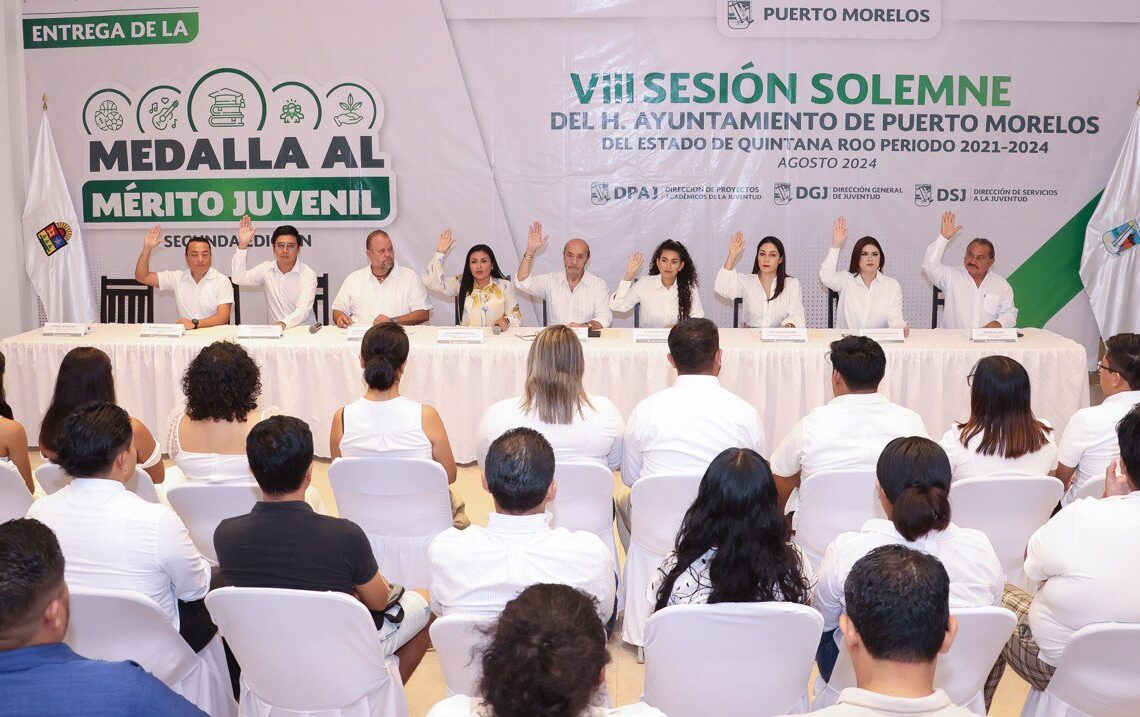 Puerto Morelos, Quintana Roo, 12 de agosto de 2024.- El Cabildo de Puerto Morelos, encabezado por la presidenta municipal Blanca Merari Tziu Muñoz, entregó hoy, en el marco de su VIII Sesión Solemne, la Medalla al Mérito Juvenil que, en su segunda edición, se otorgó a cinco jovencitas por logros académicos, culturales y artísticos, deportivos, sociales y en la protección al medio ambiente.
