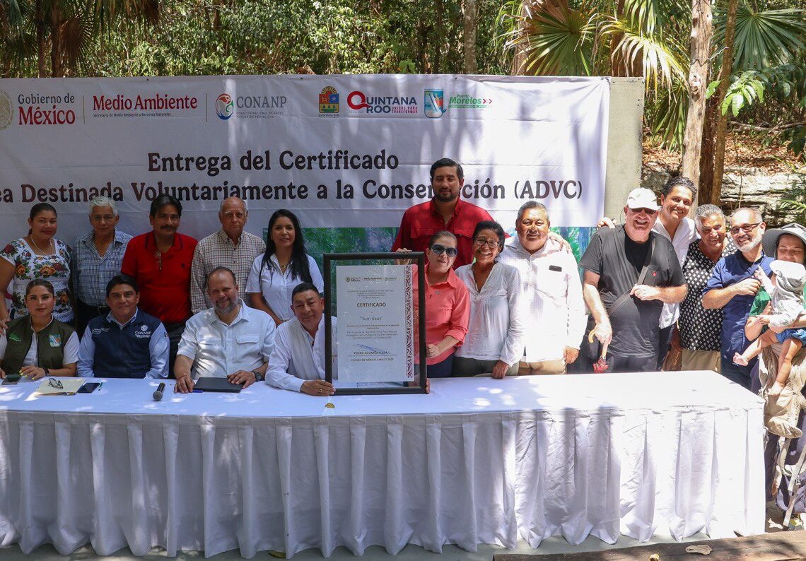 El Teatro al aire libre del Jardín Botánico Dr. Alfredo Barrera Marín fue el escenario donde se entregó el “Certificado de Área Destinada Voluntariamente a la Conservación (ADVC) Yum Kaax” al Ejido Puerto Morelos, el cual manifestó su voluntad de destinar 5,000 hectáreas de tierra de uso común como Área Natural Protegida (ANP).