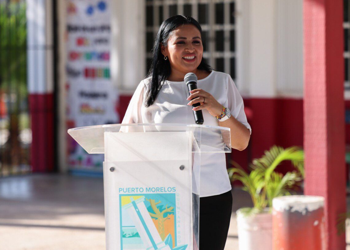 Puerto Morelos, Quintana Roo, 3 de septiembre de 2025.—La presidenta municipal Blanca Merari Tziu Muñoz acompañó esta mañana a Reynaldo Miguel Sebastián, director de Planeación de la Secretaría de Educación (SEQ) Zona Norte, en la ceremonia de inicio oficial del ciclo escolar 2025-2026, en la primaria “Benjamín Sabido Rosado”, y la entrega de 4 mil 943 paquetes de apoyo escolar para alumnos de preescolar, primaria y secundaria de todo el municipio, provenientes del Gobierno del Estado.