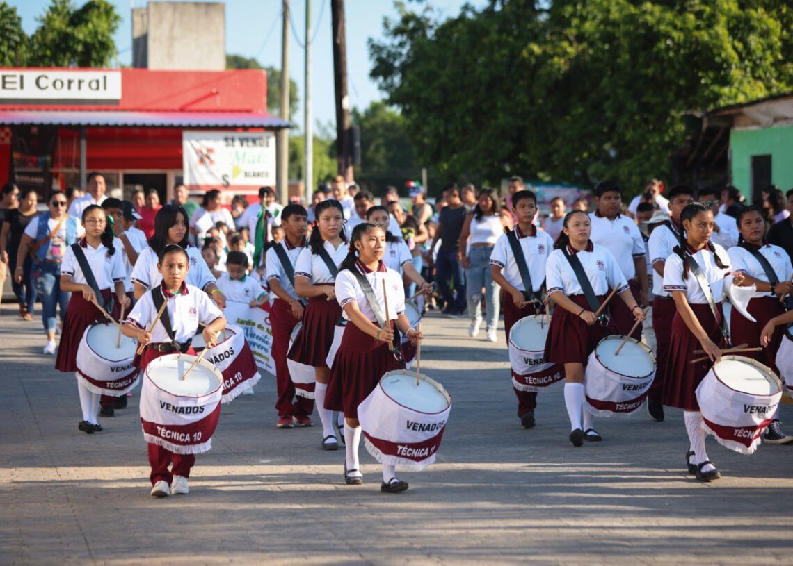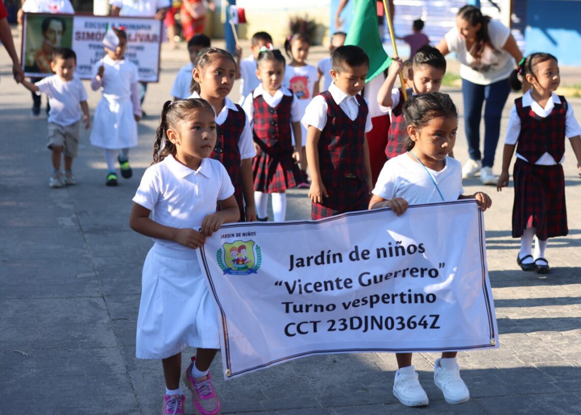 Previamente, en Leona Vicario, se realizó el desfile, presidido por el secretario General del Ayuntamiento, José de Jesús Espinosa Payán; el regidor José María Vera Uribe, los directores del CECyTe y de la escuela Simón Bolívar, así como la presidenta del Cabildo Infantil, Marlen Ramos, y las señoritas Independencia y Libertad.