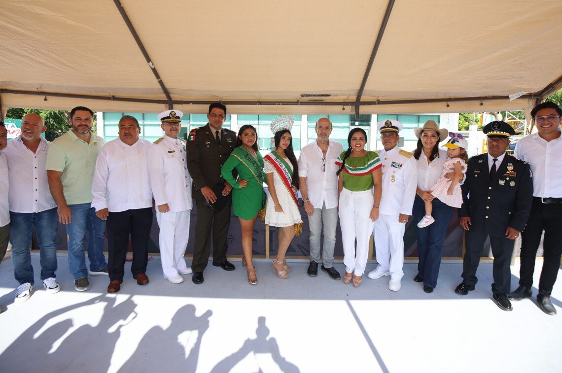 Acompañada por regidores, representantes del Ejército, Marina, Guardia Nacional y las Señoritas Independencia y Libertad, Brittanny Sherlyn Guillén Villar y Diana Naomy Pool Canché, vio pasar ante el palco de honor, instalado frente al Palacio Municipal, a 16 contingentes conformados por unas 3,000 personas y una docena de vehículos.
