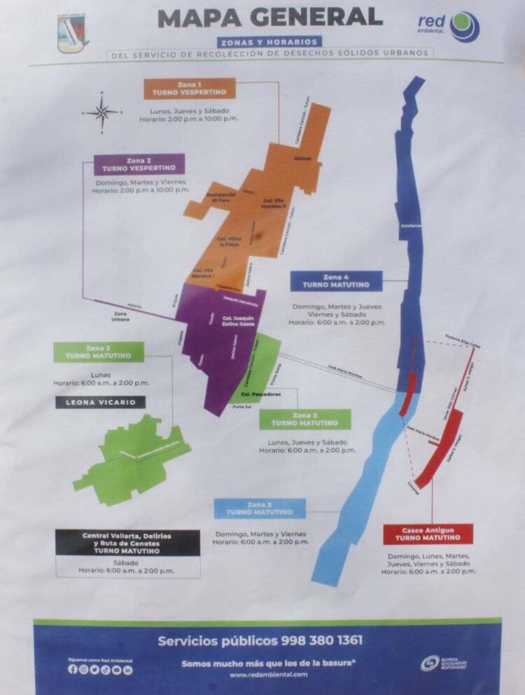 La Zona 3 será lunes, jueves y sábado de 6 de la mañana a 2 de la tarde y comprende la colonia Pescadores, además de la delegación de Leona Vicario, donde los camiones pasarán los lunes, mientras que en Central Vallarta, Delirios y la Ruta de los Cenotes el servicio se brindará los sábados en ese mismo horario.