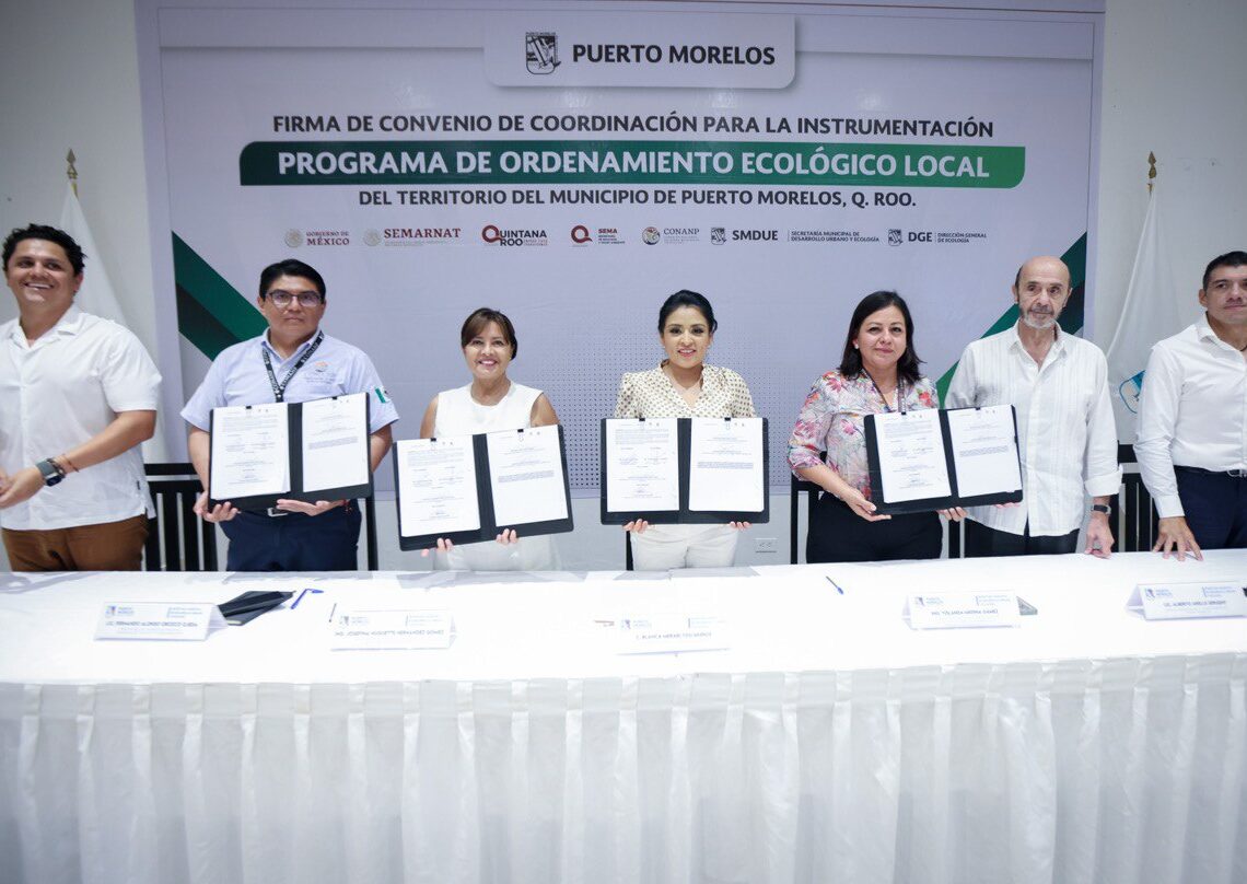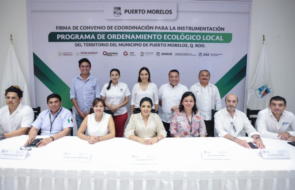 Puerto Morelos, Quintana Roo, 30 de mayo de 2023.- Con el objetivo de sentar un precedente legal que permita trabajar en la protección, cuidado y sustentabilidad de Puerto Morelos, la presidenta municipal Blanca Merari Tziu Muñoz firmó esta tarde el convenio de coordinación que establece las bases para la instrumentación del proceso tendente a la formulación, aprobación, expedición, ejecución, evaluación y modificación del Programa de Ordenamiento Ecológico Local (POEL) Participativo.