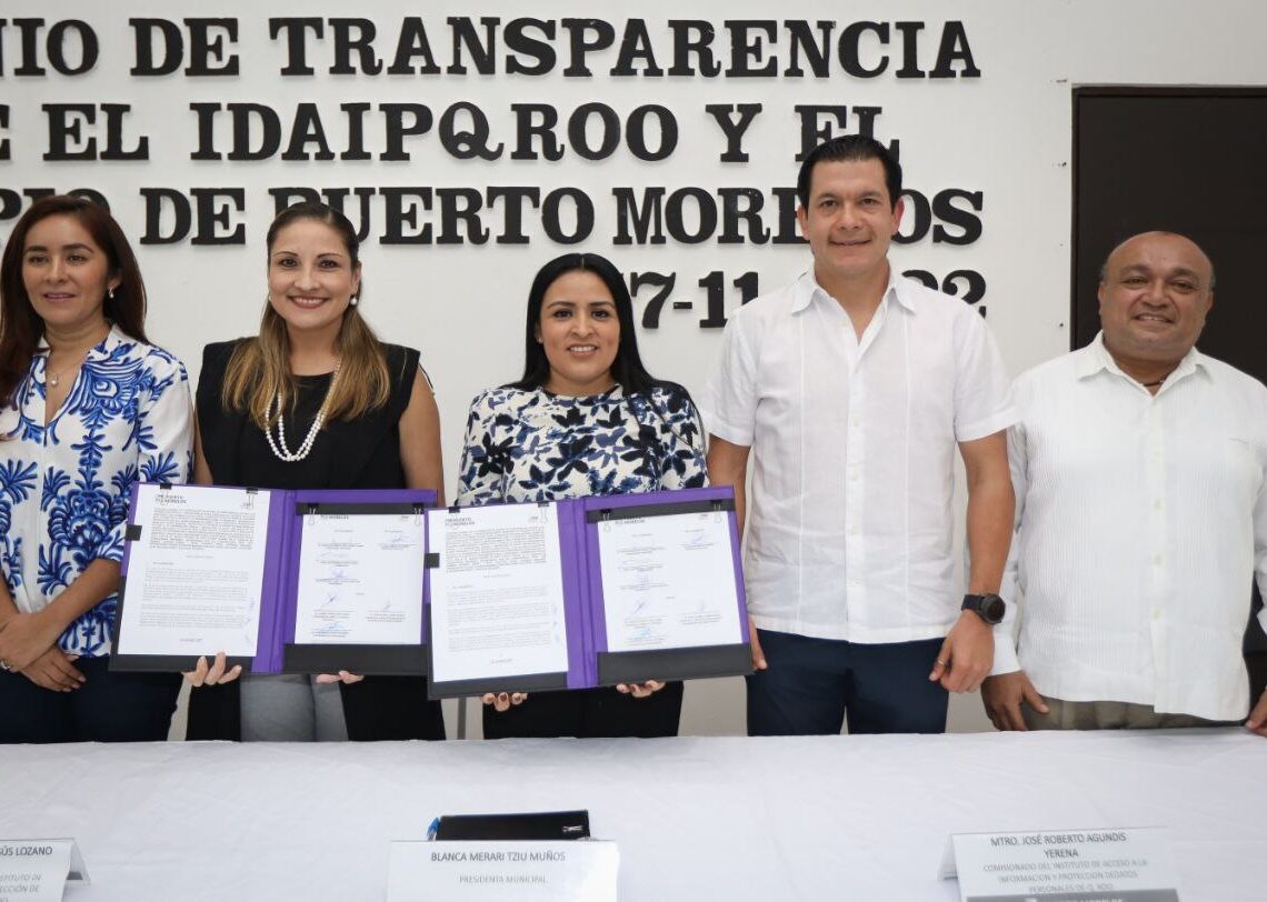 Puerto Morelos, Quintana Roo, 17 de noviembre de 2022.- Con el propósito de fortalecer la cultura cívica de transparencia, a través de la capacitación y actualización permanente del personal del Ayuntamiento, la presidenta municipal Blanca Merari Tziu Muñoz firmó hoy un convenio de colaboración en materia de transparencia con el Instituto de Acceso a la Información y Protección de Datos Personales de Quintana Roo (IDAIPQROO).