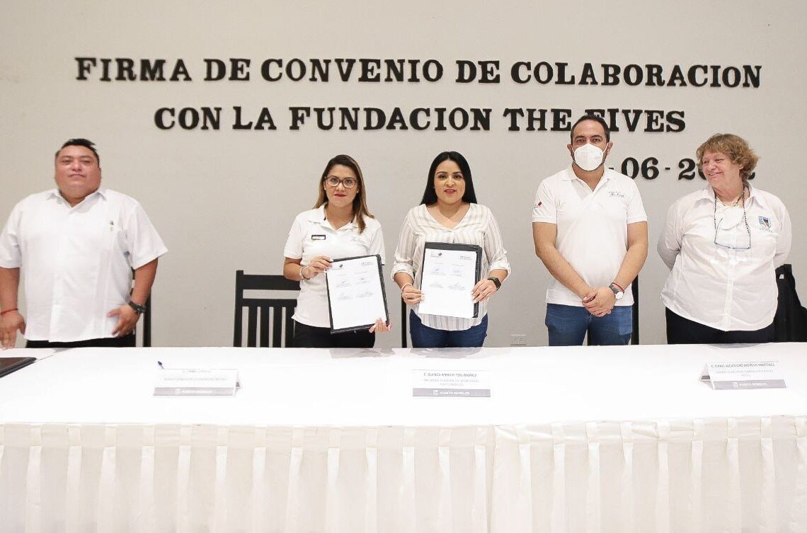 Puerto Morelos, Quintana Roo, 17 de junio de 2022.- La presidenta municipal Blanca Merari Tziu Muñoz firmó hoy, en la Sala de Cabildo, un convenio de colaboración con la Fundación The Fives, que tiene como objetivo apoyar a la gente que más lo necesita, principalmente a la niñez portomorelense.