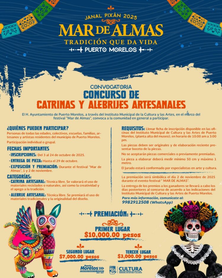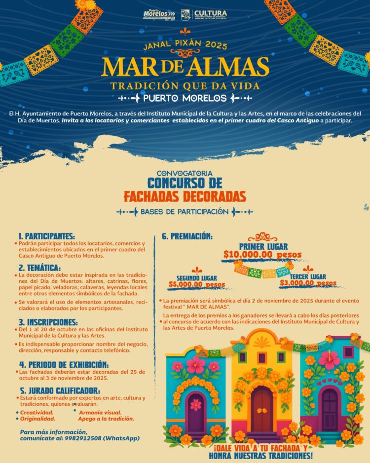 Puerto Morelos, Quintana Roo a 15 de octubre de 2025.- Con motivo de la celebración del Día de Muertos en México, tradición que honra a los difuntos con ofrendas y altares, la presidenta Blanca Merari Tziu Muñoz invita a la población a unirse a esta festividad, los días 1 y 2 de noviembre a la procesión de embarcaciones decoradas dentro del festival “Janal Pixan 2025, Mar de Almas, Tradición que da Vida”.