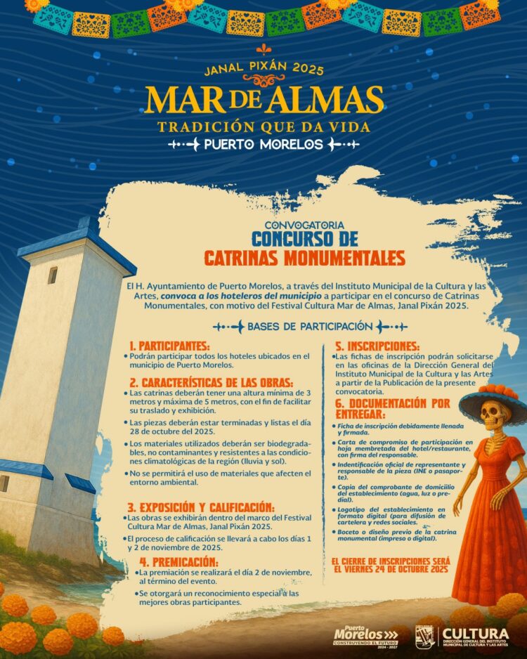 La directora del Instituto Municipal de Cultura y las Artes, Adriana Nava Gómez, instancia organizadora del Festival, dio a conocer que se lanzó la convocatoria en una edición del Janal Pixan 2025, con la nueva propuesta para que participen embarcaciones que harán brillar la costa de Puerto Morelos en dos días de recorrido para deleite de residentes y turistas.