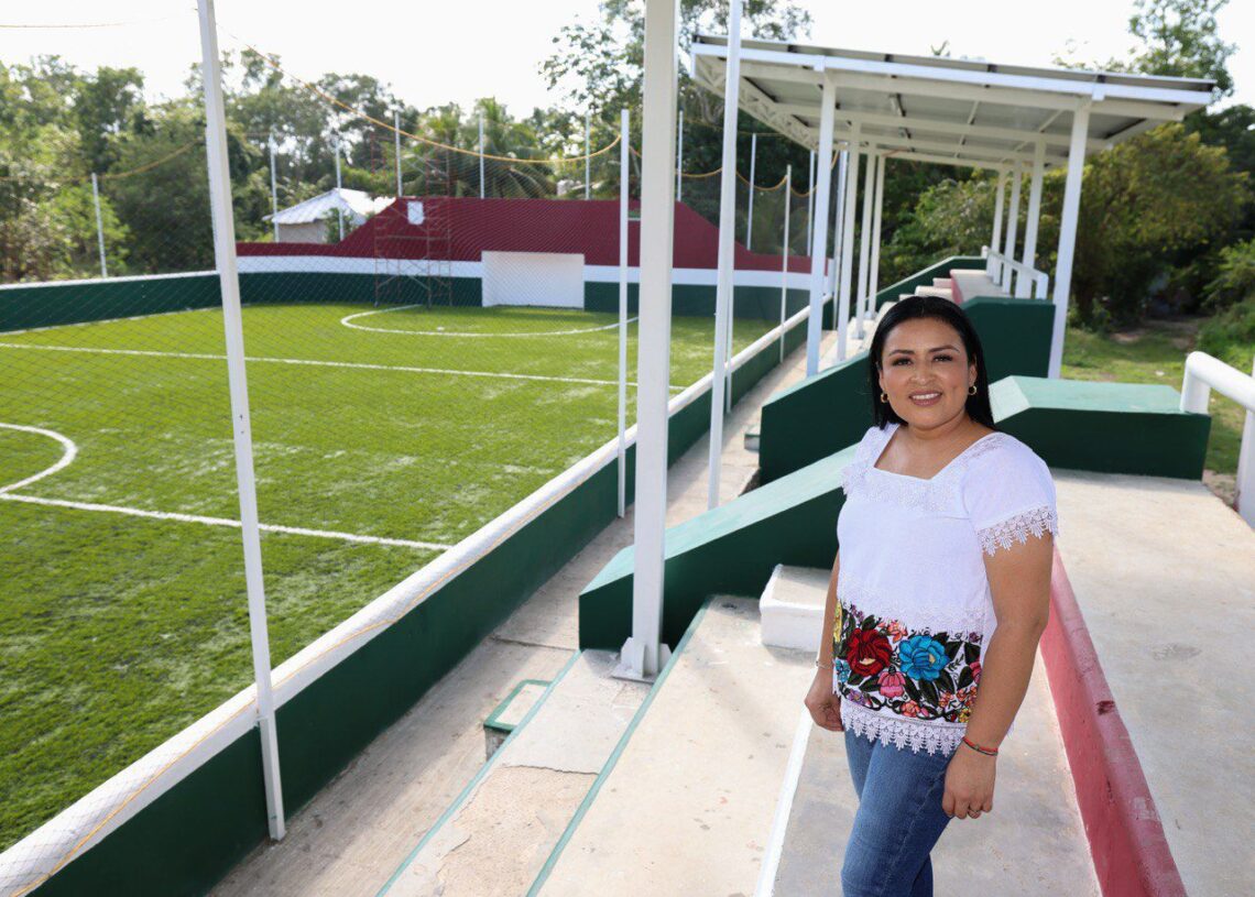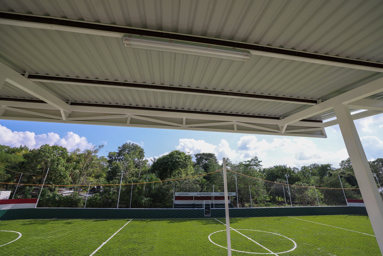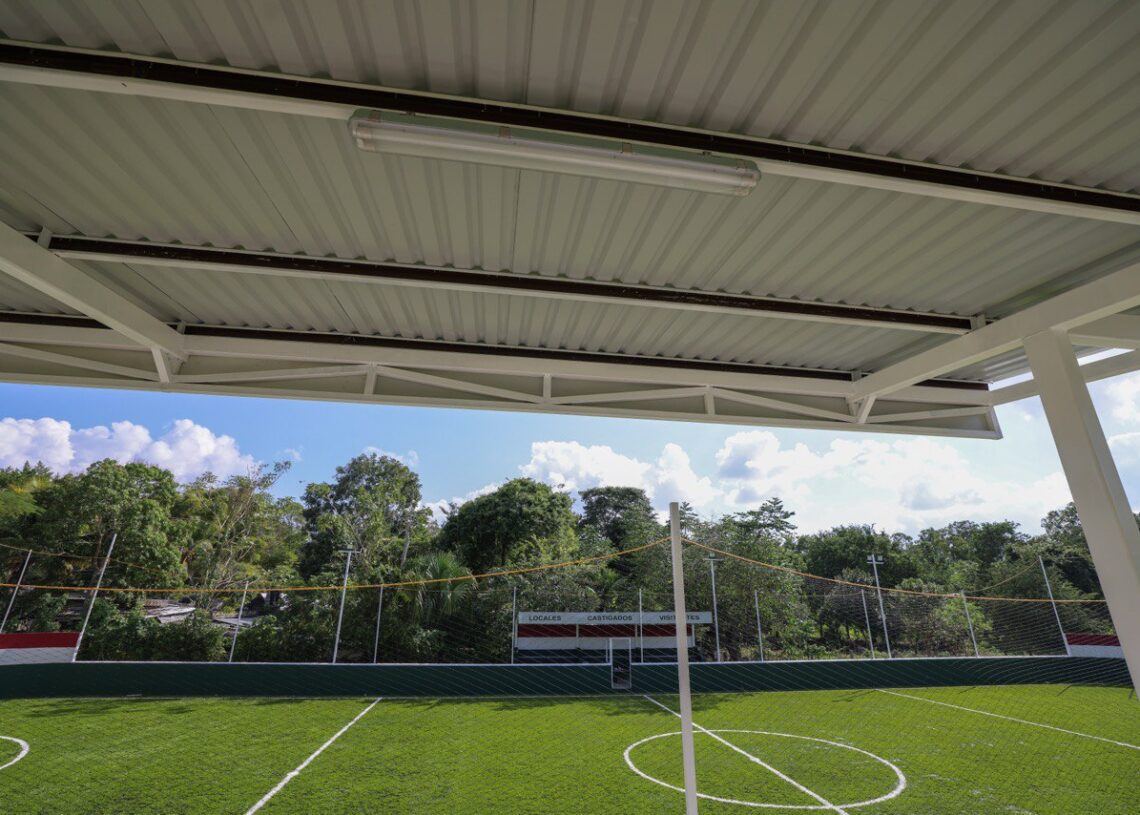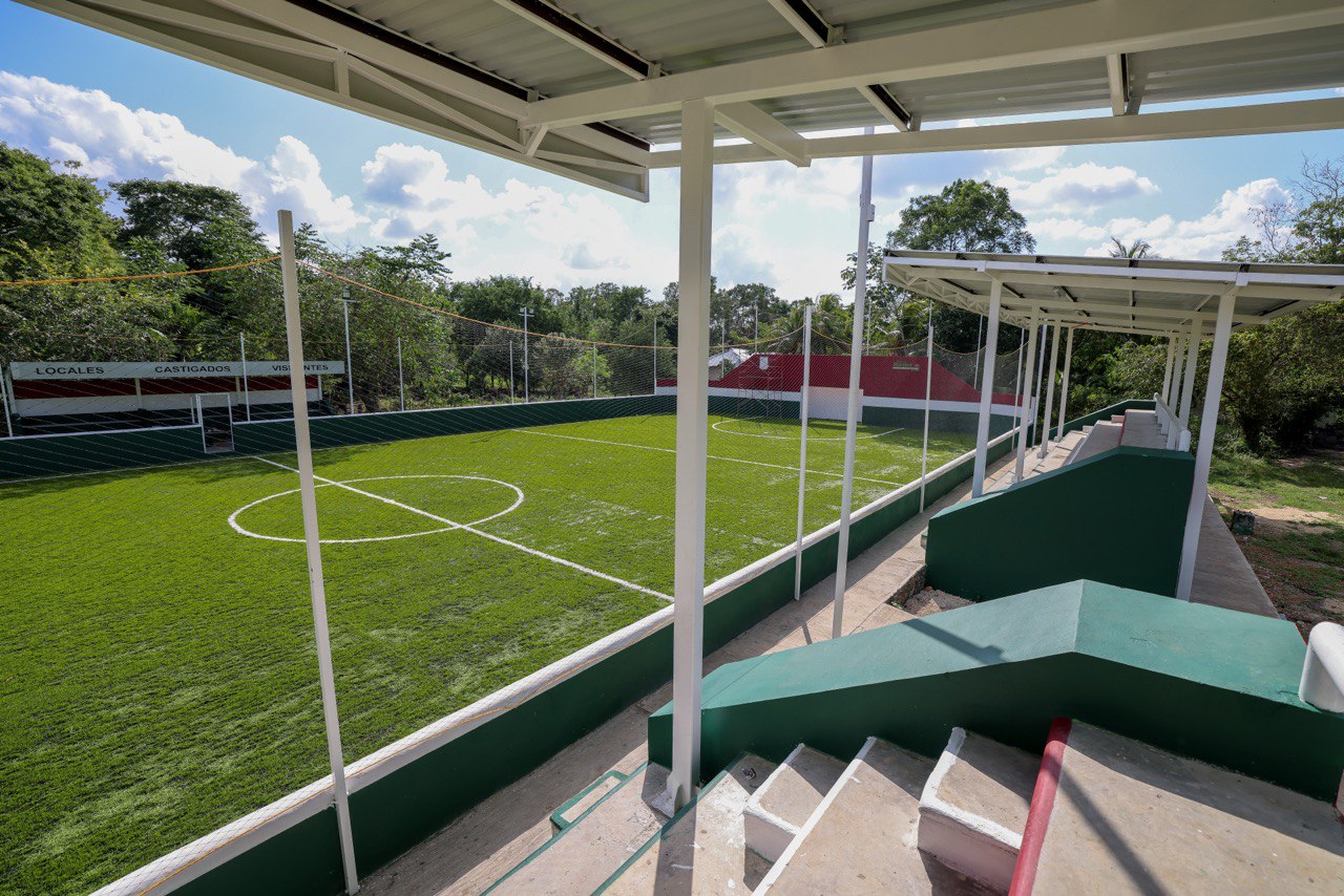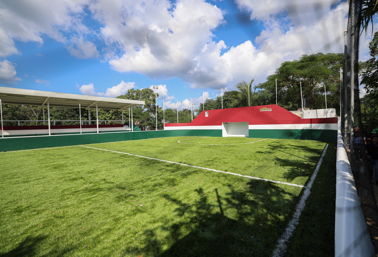 “Realizamos la instalación de más de mil 180 metros cuadrados de pasto sintético de alta calidad, iluminación LED, rehabilitación de gradas, bancas y sanitarios, además de pintura, señalización y malla perimetral, lo que permite contar con un espacio moderno y adecuado para la práctica deportiva y actividades comunitarias”, señaló.