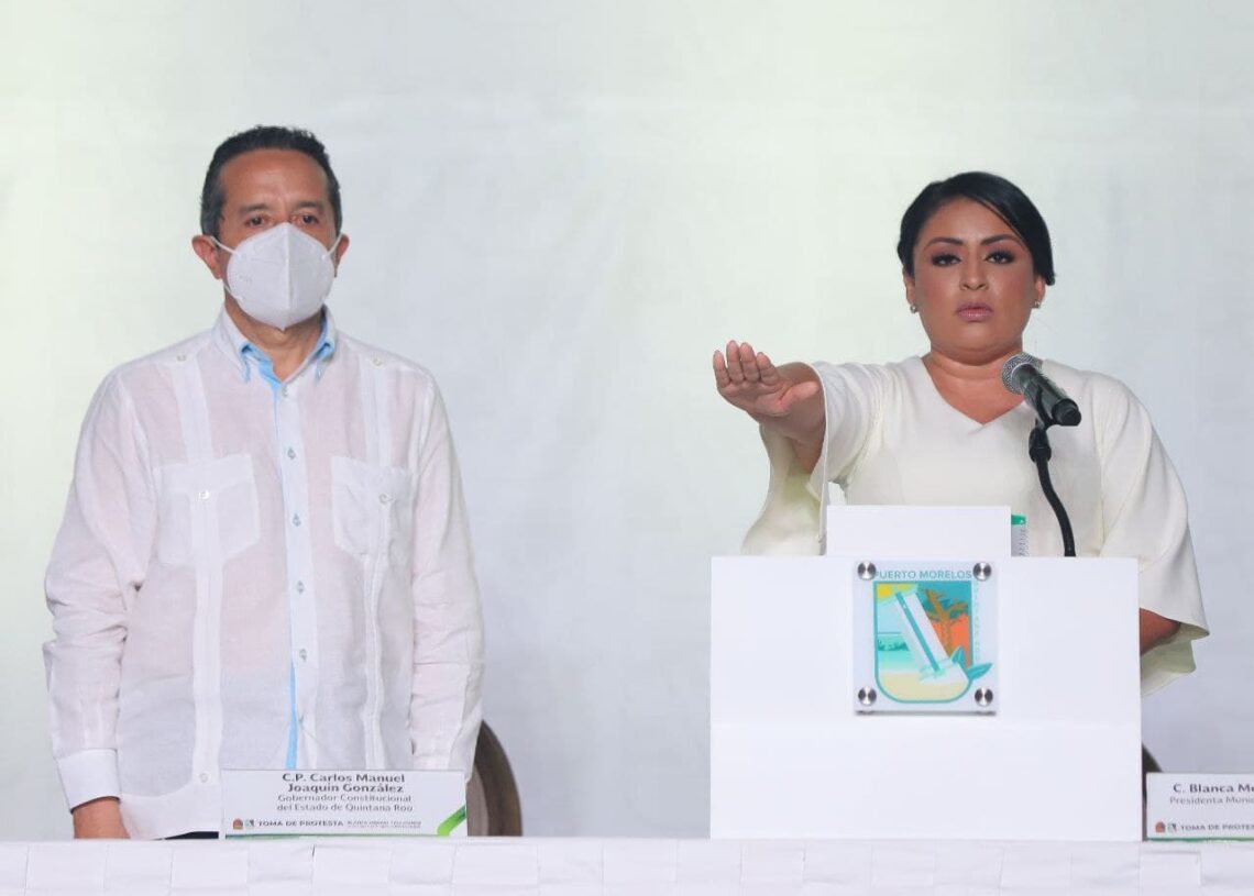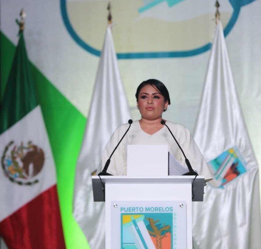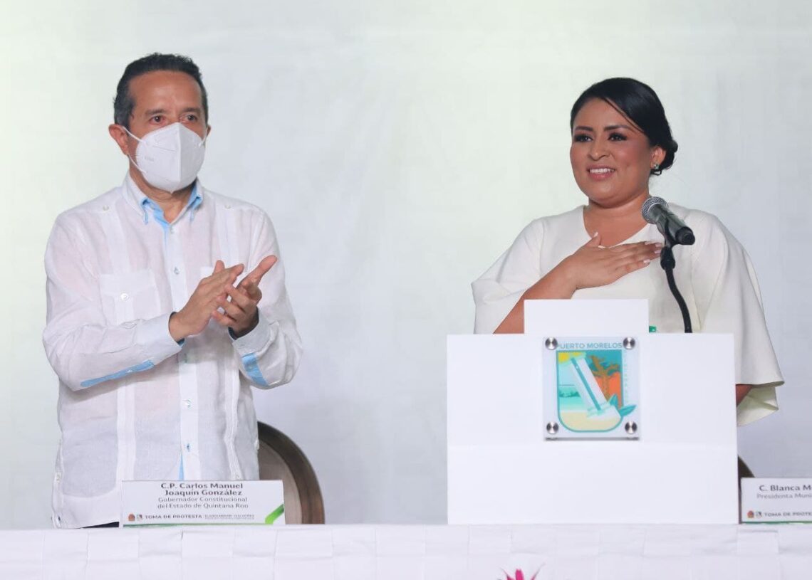 Acompañada del Gobernador Carlos Manuel Joaquín González, de la Diputada Tiara Schleske de Ariño, representante de la XVI Legislatura Local, del Magistrado Presidente del Tribunal Superior de Justicia, José Antonio León Ruiz, así como del vicepresidente de la Asociación de Hoteles de Cancún, Puerto Morelos e Isla Mujeres para Puerto Morelos, en representación de su Presidente, Roberto Cintrón, Héctor López Trucios y del presidente de la Asociación Mexicana de Agencias de Viajes en Quintana Roo, Sergio González Rubiera, la alcaldesa destacó que tres valores marcarán su administración, fortaleza, esperanza y honestidad.