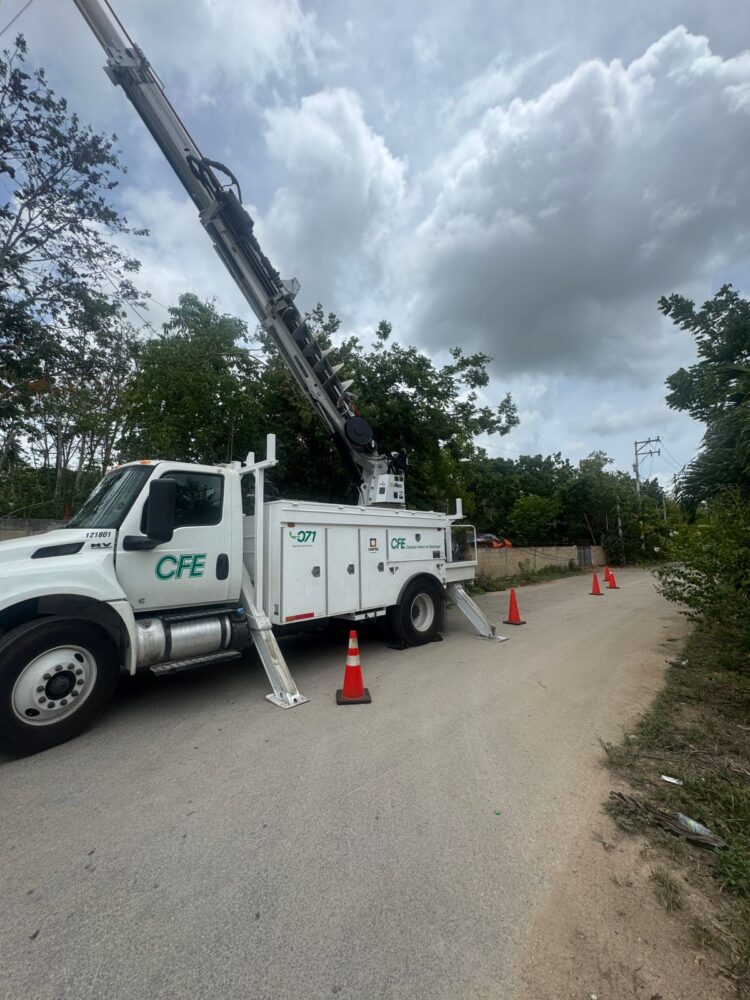 Leona Vicario, Puerto Morelos, Quintana Roo, 31 de agosto de 2025.—El gobierno de Puerto Morelos mantiene trabajos coordinados con la Comisión Federal de Electricidad (CFE) para impulsar el desarrollo de esta Delegación y llevar bienestar a la población con la renovación de sus cables de distribución de energía y la habilitación de un nuevo ramal para ampliar el área que recibe el servicio.
