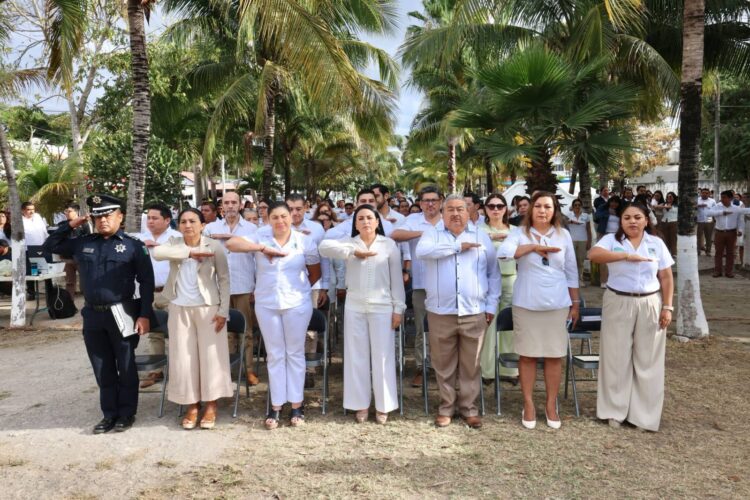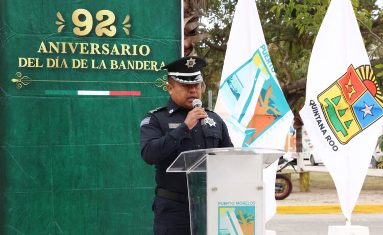Puerto Morelos, Quintana Roo a 24 de febrero de 2026.- La presidenta Blanca Merari Tziu encabezó la Ceremonia por el 92 Aniversario de celebrarse oficialmente el Día de la Bandera de México, llevada a cabo en la explanada frente al Palacio Municipal, rindiendo homenaje a uno de los símbolos patrios de la Nación.