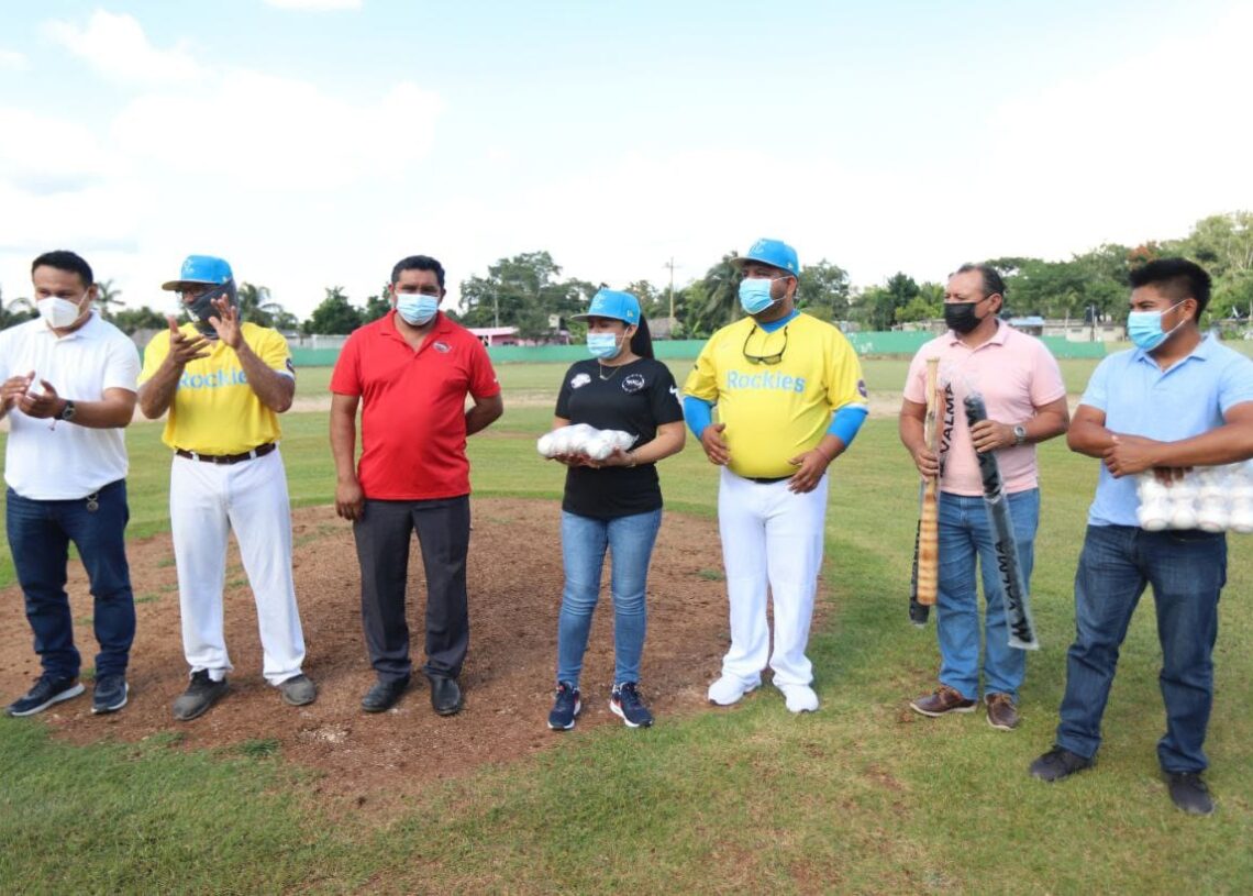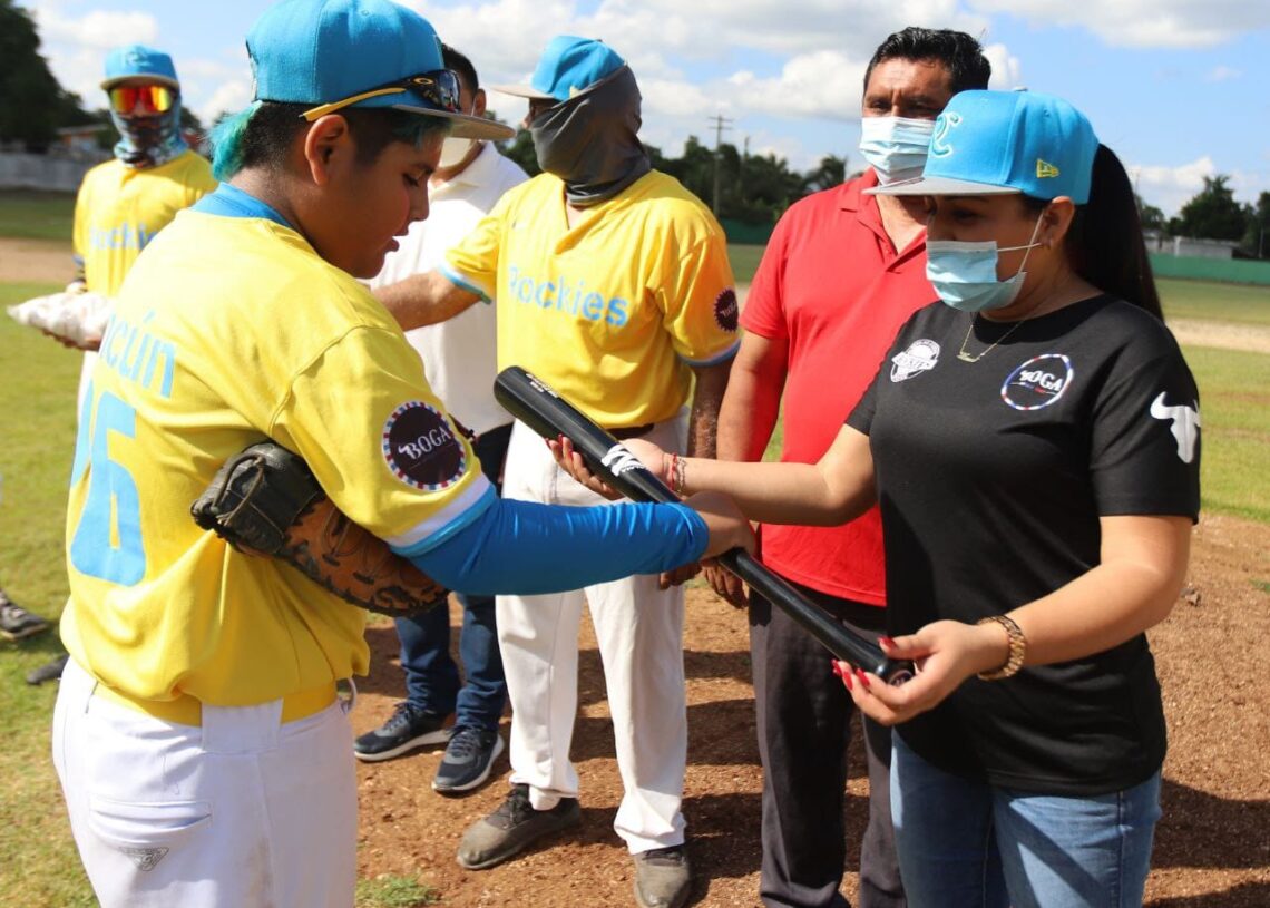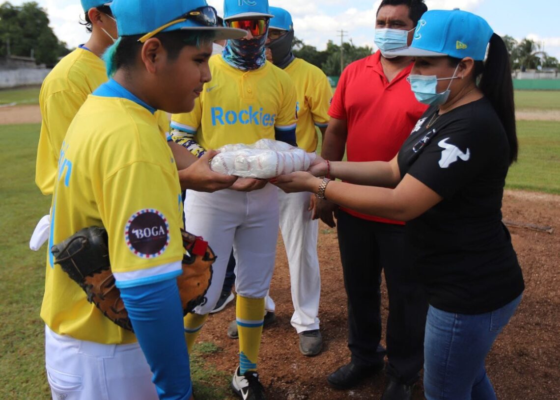 Leona Vicario, Puerto Morelos, Quintana Roo, 5 de diciembre de 2021.- La presidenta municipal Blanca Merari Tziu Muñoz reafirmó su compromiso con el deporte tanto en la cabecera municipal de Puerto Morelos, como en la comunidad de Leona Vicario, al entregar pelotas y bates de beisbol al Club Rockies, en el campo “12 de Marzo” de esta comunidad.