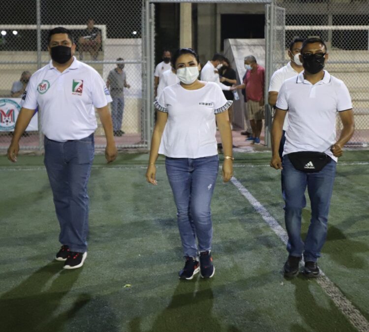 Puerto Morelos, Quintana Roo, 27 de noviembre de 2021.— La presidenta municipal Blanca Merari Tziu Muñoz dio anoche la patada inaugural del Campeonato Nacional de Fútbol 7 en el Campo Deportivo de la colonias Pescadores, que concluirá mañana domingo.