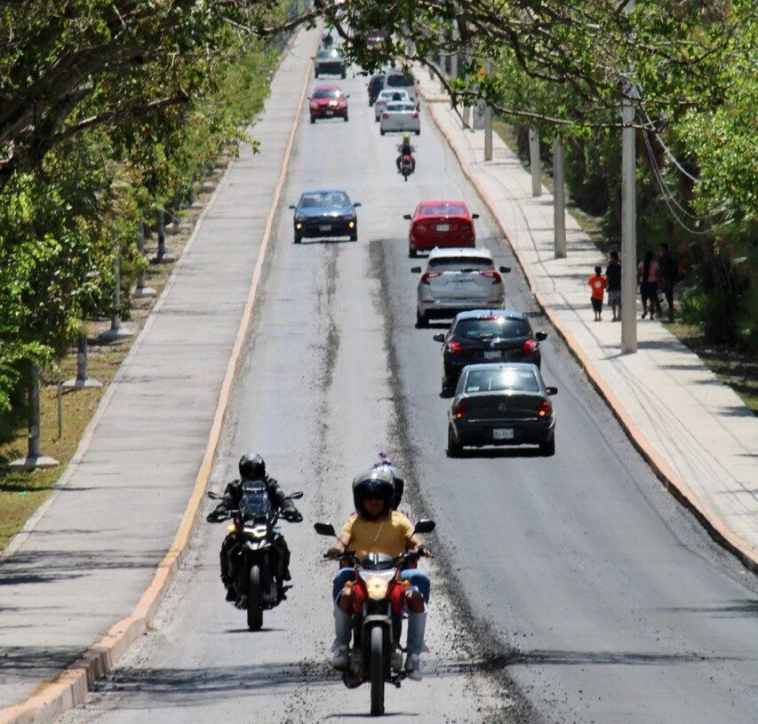 Puerto Morelos, Quintana Roo, 11 de abril de 2023.- La avenida José María Morelos, que es el principal acceso y salida de la zona turística de Puerto Morelos, comenzó hoy a lucir una nueva imagen, gracias a las labores de reencarpetamiento que arrancaron ayer por la noche.