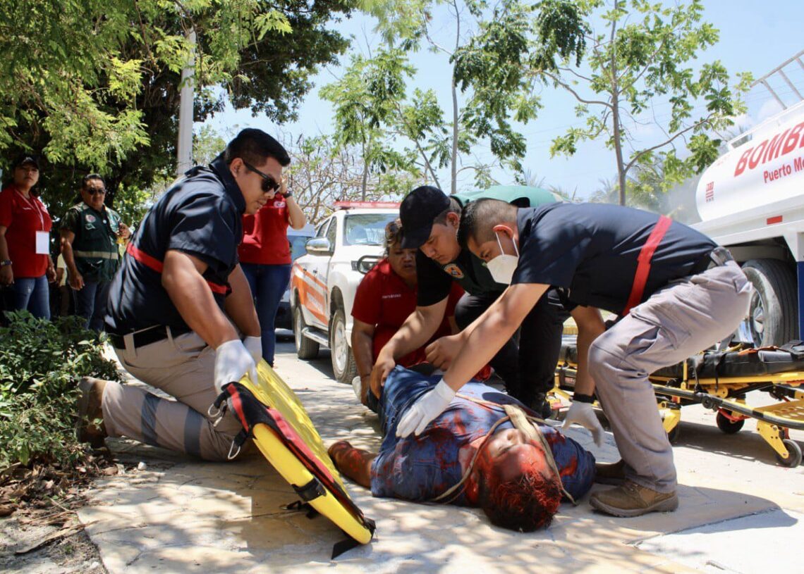 Puerto Morelos, Quintana Roo, 19 de abril de 2023.— Coordinados por Protección Civil de este municipio, casi medio centenar de bomberos, paramédicos y policías, entre otros, participaron hoy en seis simulacros con motivo del Primer Simulacro Nacional de Evacuación.
