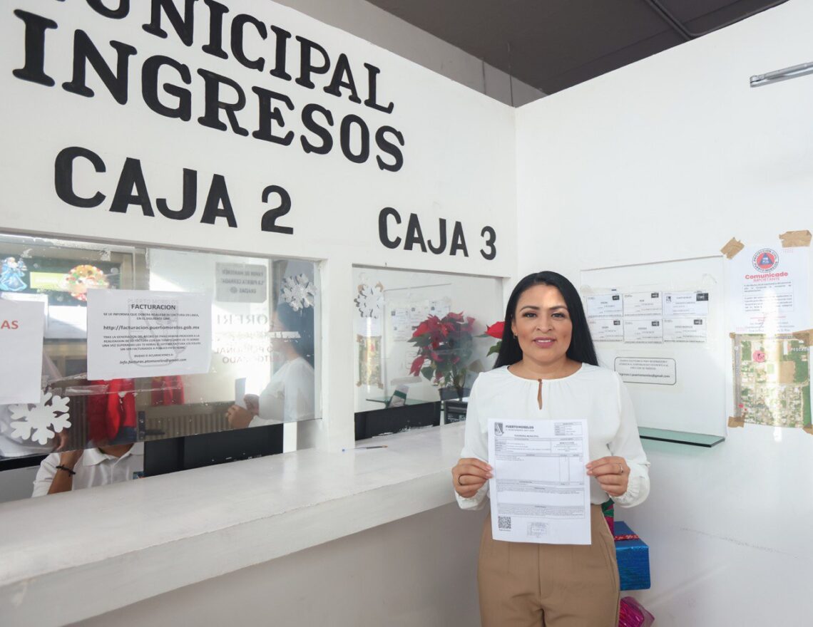 Puerto Morelos, Quintana Roo, 1 de diciembre de 2023.— Luego pagar en las cajas de la Tesorería Municipal su impuesto predial, la presidenta municipal Blanca Merari Tziu Muñoz invitó a los más de 18 mil contribuyentes del gravamen en el municipio a que lo cubran y aprovechen el programa de descuentos por pago anticipado.