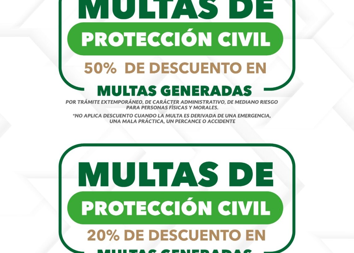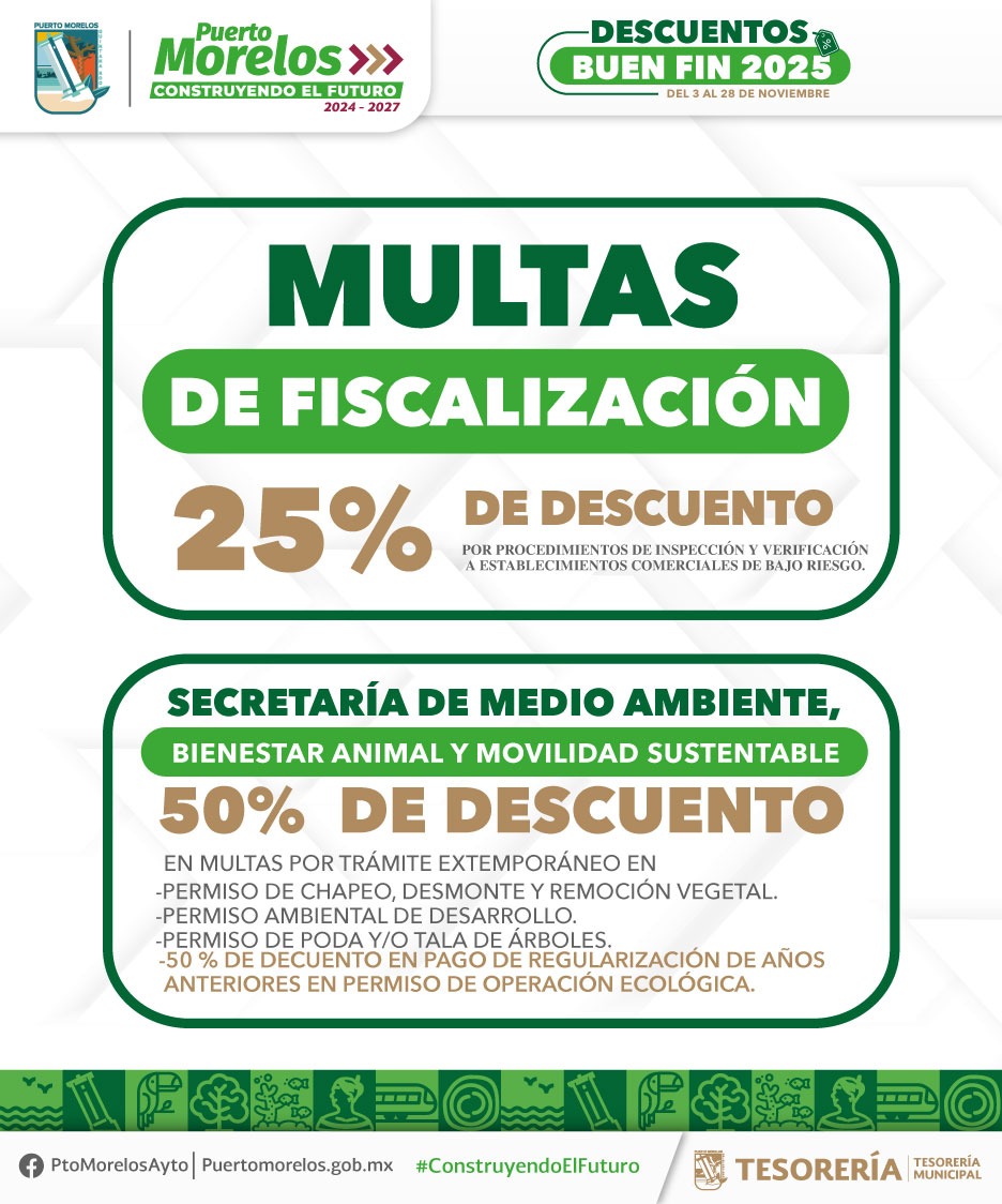 La Secretaría de Medio Ambiente, Bienestar Animal y Movilidad Sustentable otorga 50 por ciento de descuento en multas por pago extemporáneo por permisos de chapeo, desmonte y/o remoción vegetal; permiso ambiental de desarrollo, poda y/o tala, y 50 por ciento en regularización de años anteriores por permisos de operación ecológica.