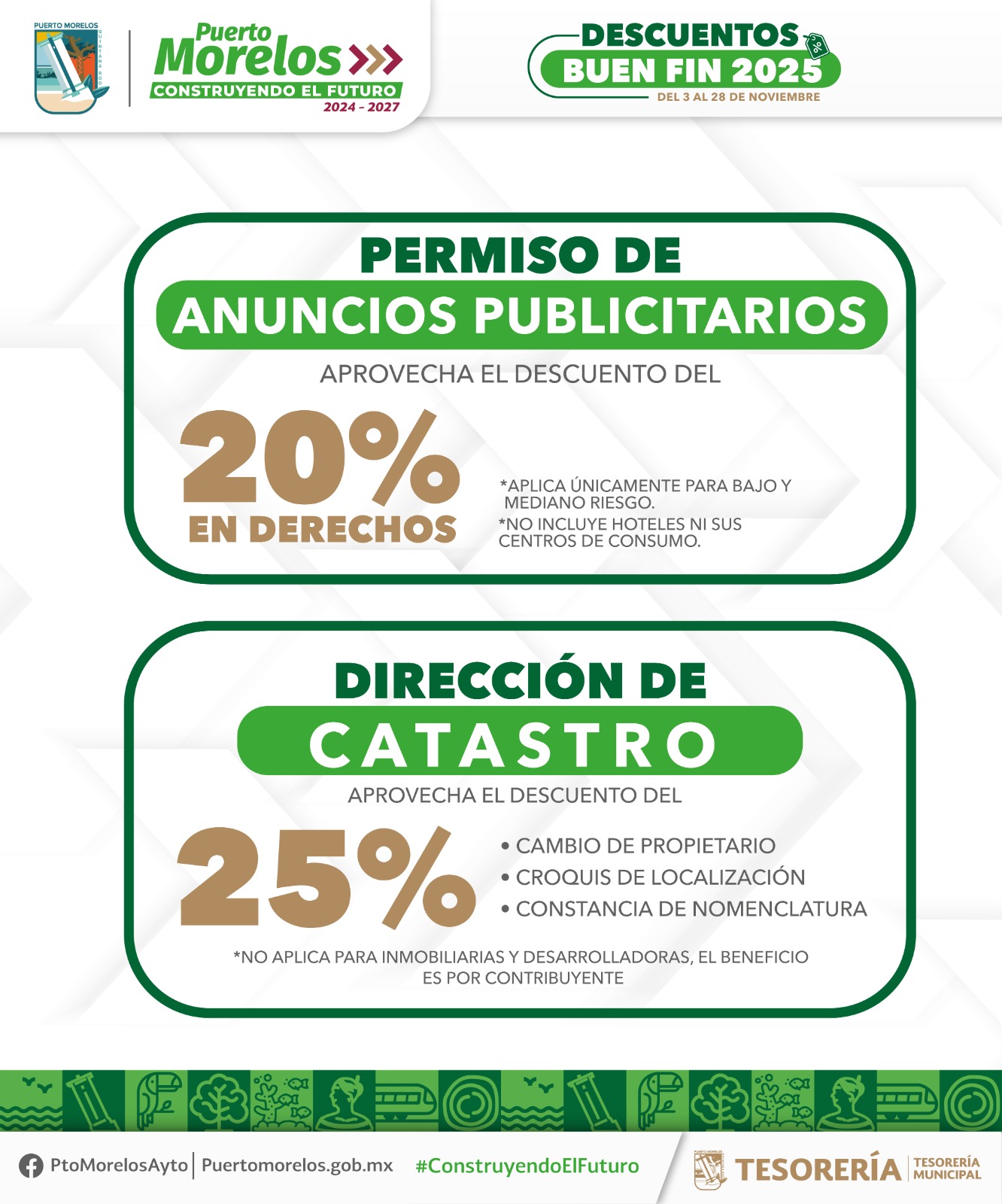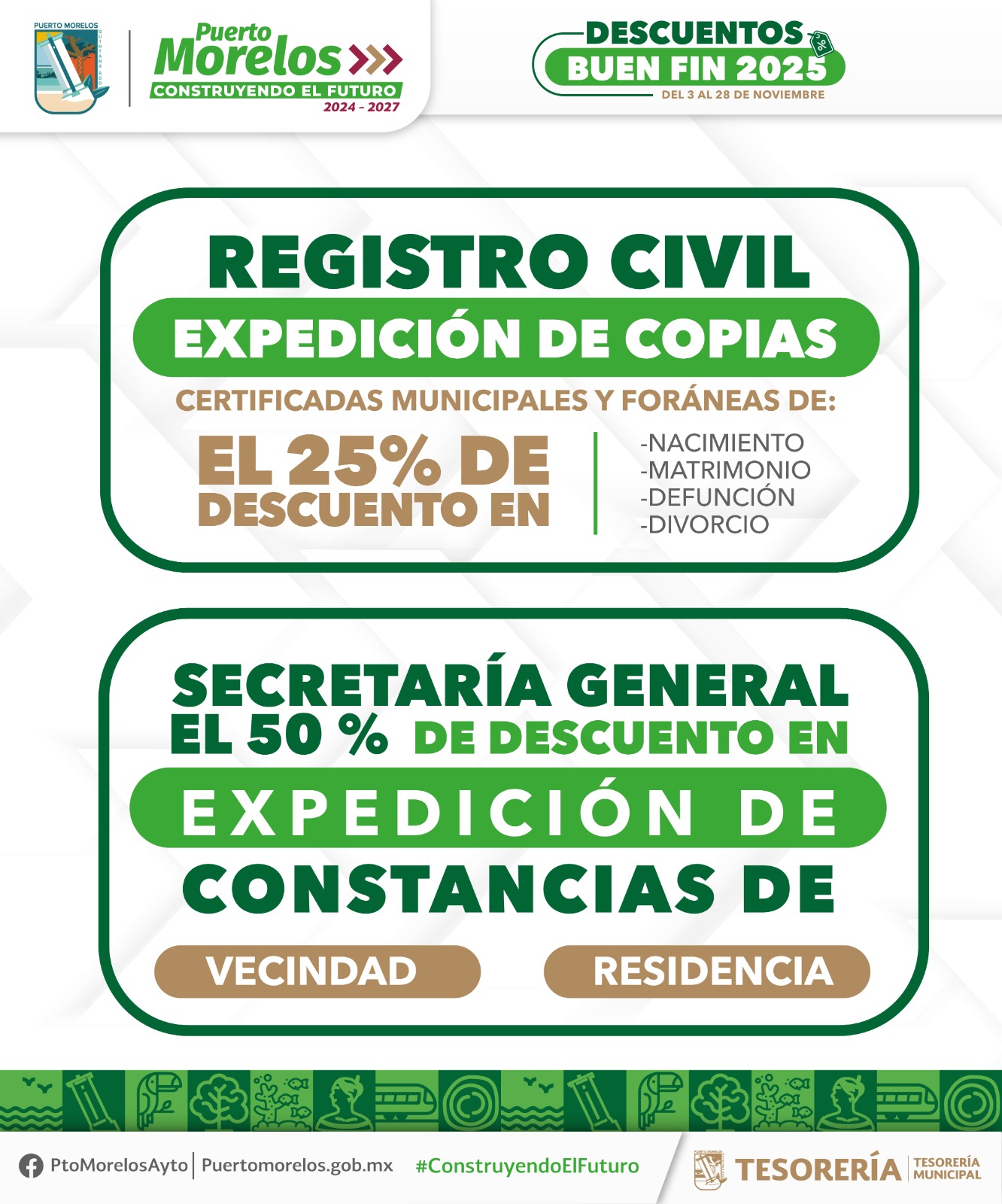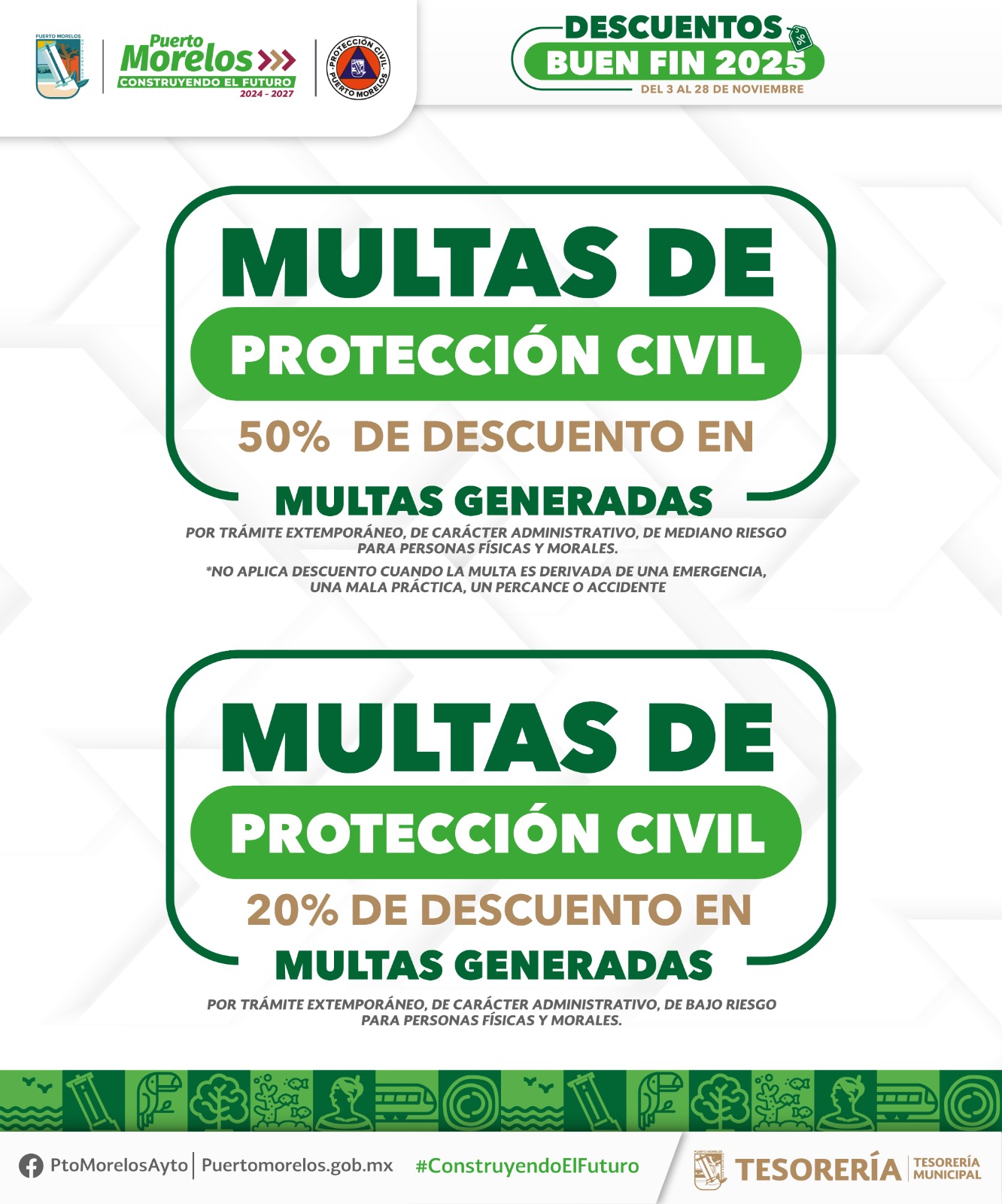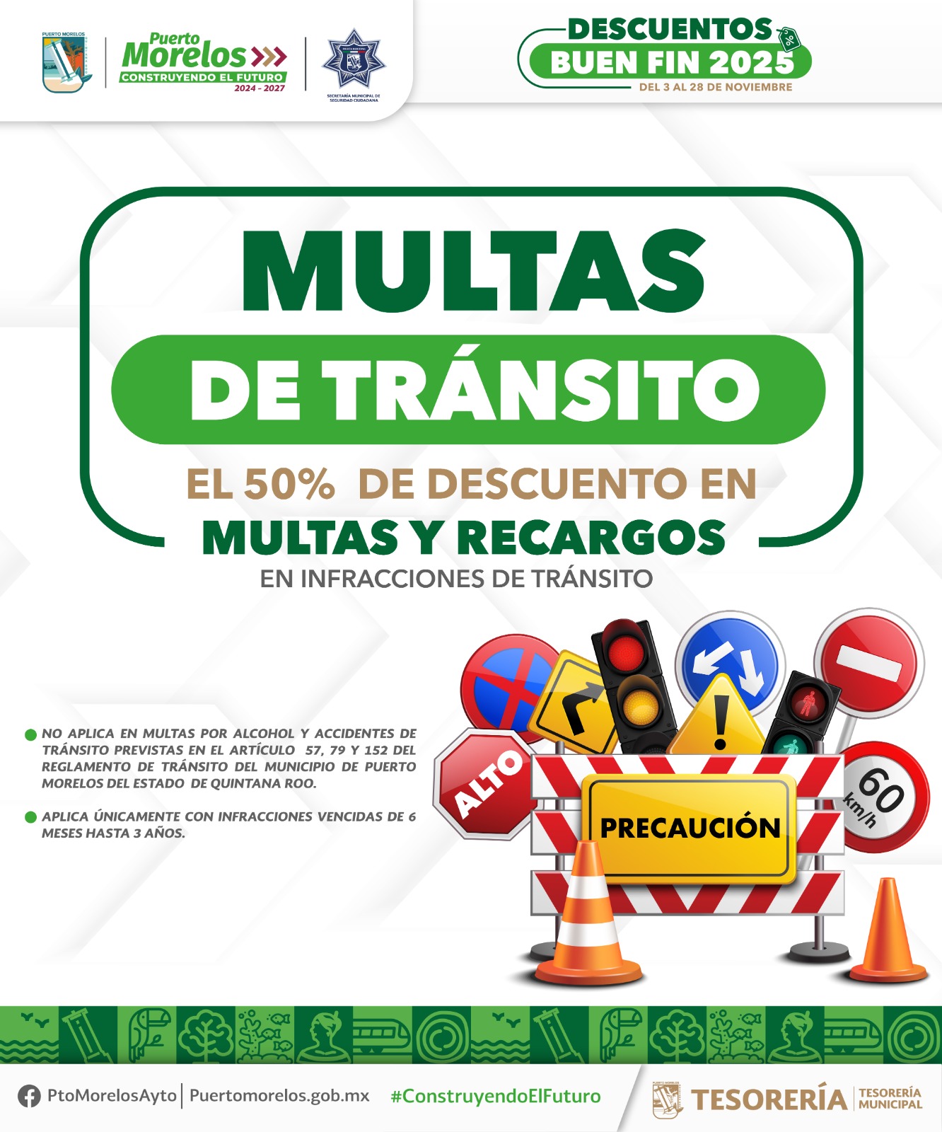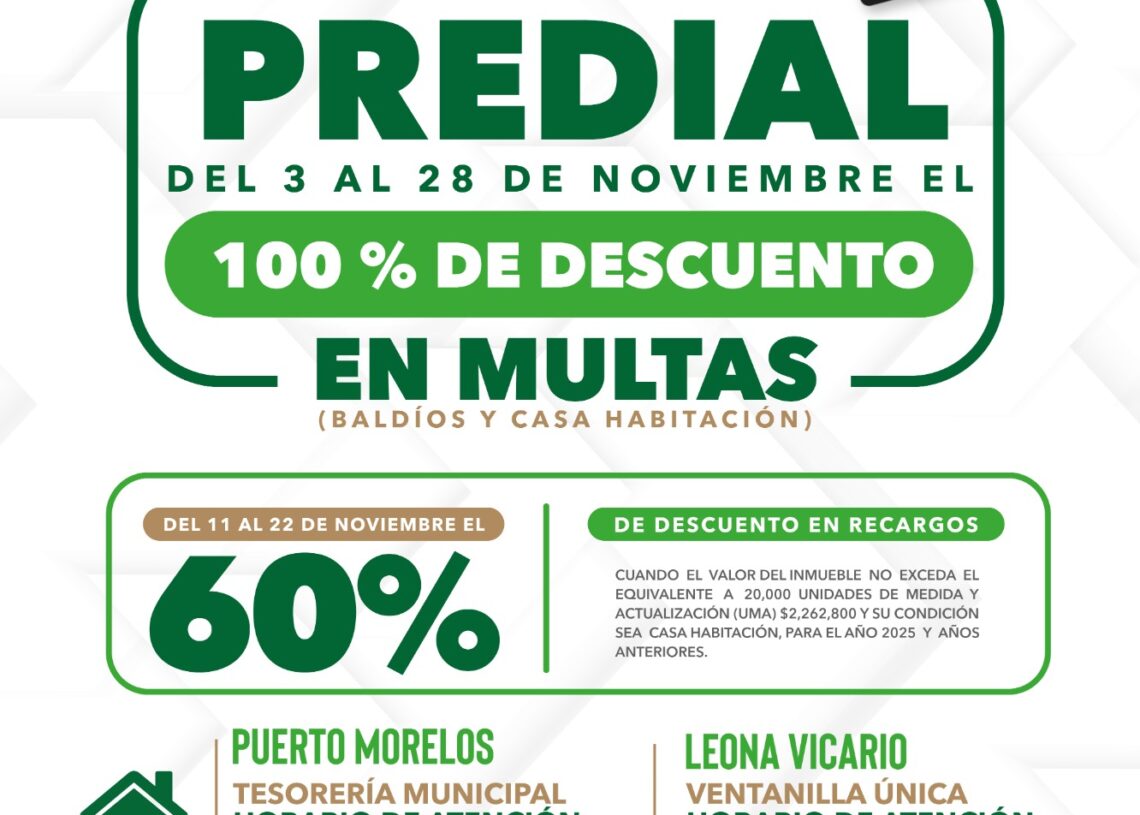 Puerto Morelos, Quintana Roo, 7 de noviembre de 2025.— La presidenta municipal Blanca Merari Tziu Muñoz recordó a los contribuyentes portomorelenses la puesta en marcha de la Jornada de Descuentos “El Buen Fin 2025”, que comenzó el lunes 3 del presente mes y concluirá el viernes 28, a fin de que obtengan importantes rebajas en multas y recargos.