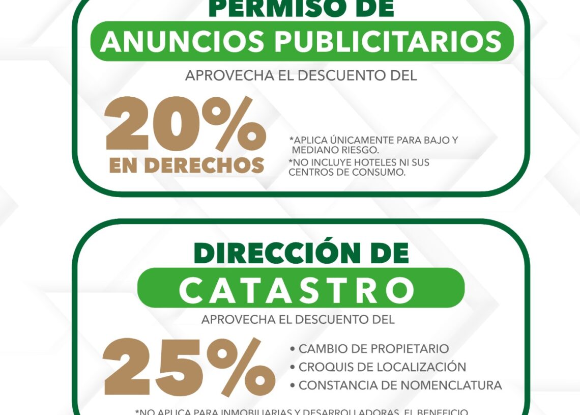 Además, en permisos de uso de suelo comercial se otorga 20 por ciento de descuento en el pago de derechos. No se consideran hoteles ni sus centros de consumo. Por permisos para anuncios publicitarios, se otorga 20 por ciento de descuento, siempre que sea para negocios de bajo y mediano riesgo. Tampoco se considera a los hoteles y sus centros de consumo.