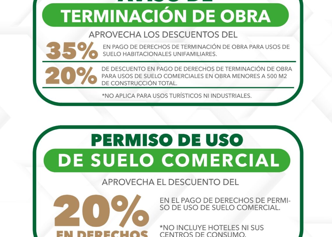 La Secretaría de Desarrollo Urbano y Ordenamiento Territorial ofrece 35 por ciento de descuento en avisos de terminación de obra y pago de derechos de uso de suelo habitacional unifamiliar, además de 20 por ciento en pago de derechos de terminación de obra para uso de suelo comercial en obras menores a 500 metros cuadrados de construcción total.