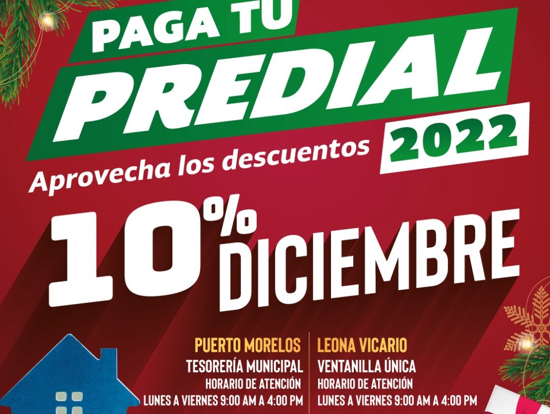 Puerto Morelos, Quintana Roo, 12 de diciembre de 2021.- El gobierno de Puerto Morelos invitó a la ciudadanía a aprovechar el descuento por el pago anticipado de predial, que en este mes de diciembre es del 10 por ciento, un estímulo que es en beneficio de la economía familiar.
