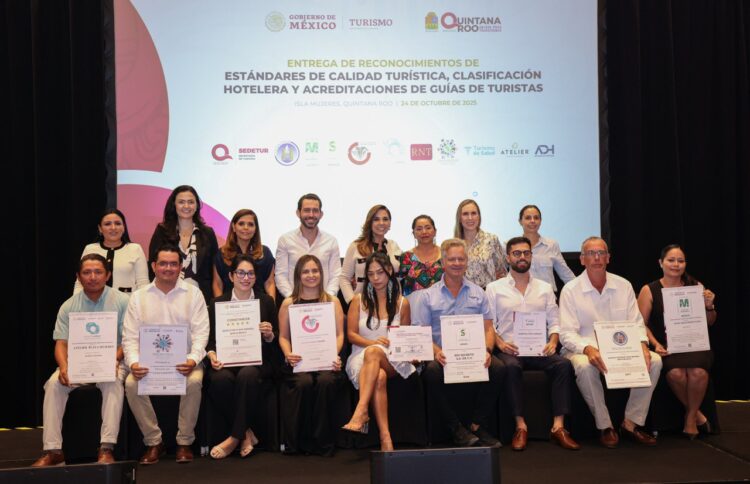 Isla Mujeres, Quintana Roo a 24 de octubre de 2025.- “Es un orgullo contar con trabajadores y trabajadoras que hacen de los destinos turísticos de Quintana Roo únicos por el trato cálido y humano”, afirmó la presidenta municipal Blanca Merari Tziu Muñoz en el marco de la entrega de Reconocimientos en Estándares de Calidad Turística, Clasificación Hotelera y Acreditaciones de Guías de Turistas.