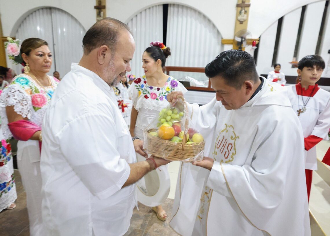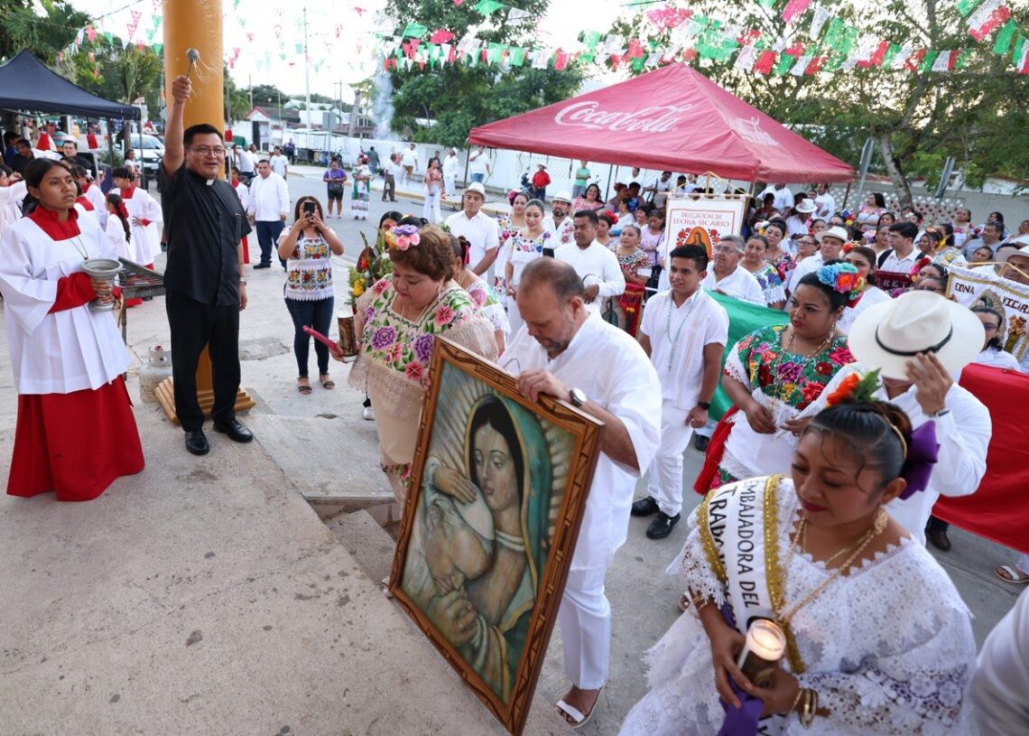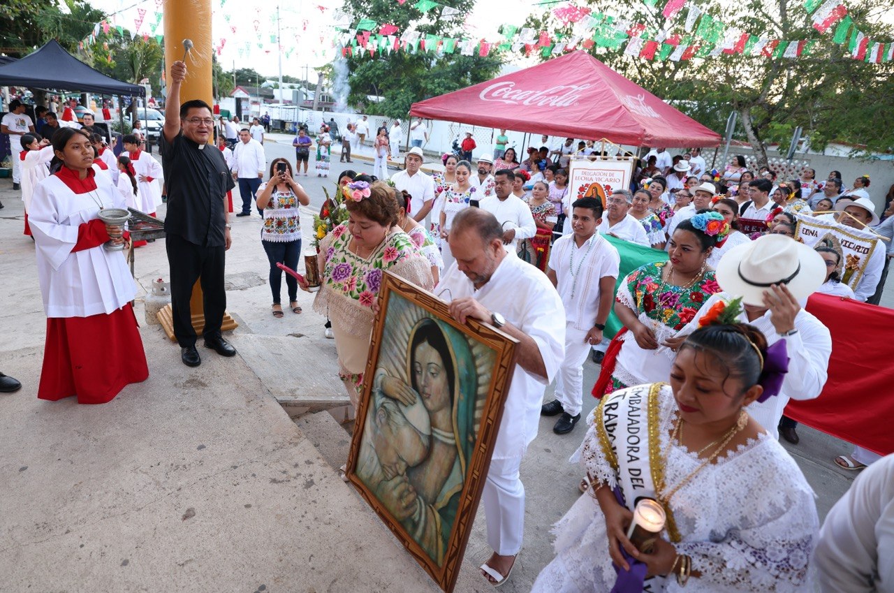 La procesión de trabajadores municipales y vecinos partió del edificio de la delegación entre “voladores” y acompañada de la Orquesta Jaranera Gameba, rodeó el parque principal y se dirigió a la iglesia de Nuestra Señora de Guadalupe, donde el Pbro. Ezequiel Buenfil Batún ofició una misa.