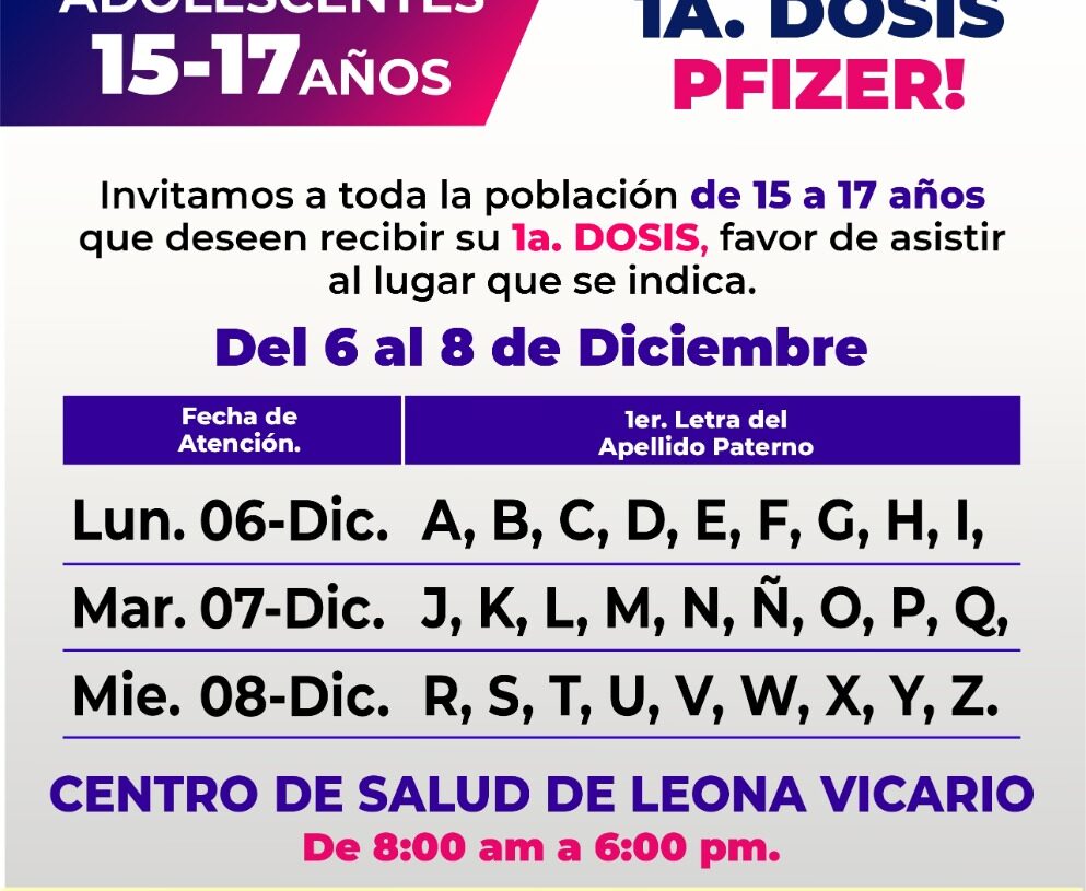 Puerto Morelos, Quintana Roo, 4 de diciembre de 2021.- Como parte del Plan Nacional de Vacunación para hacer frente a la pandemia de Covid-19, del lunes 6 al miércoles 8 de diciembre se aplicará la primera dosis de la fórmula Pfizer a jóvenes de 15 a 17 años, en el Centro de Salud de la comunidad de Leona Vicario, informó la secretaria municipal de Desarrollo Social, Juanita Chacón Canché.