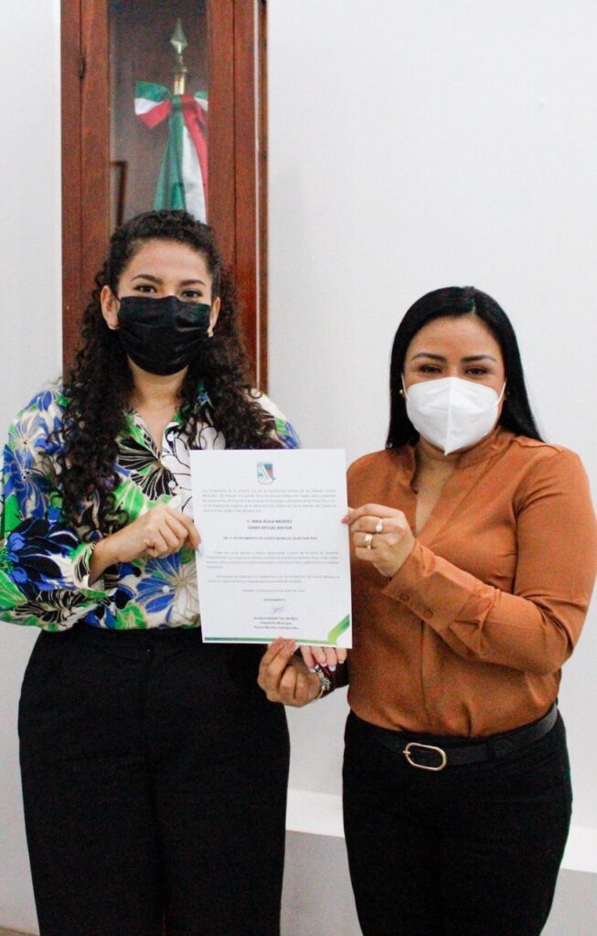 Puerto Morelos, Quintana Roo, 14 de enero de 2022.— Luego de que el Cabildo de Puerto Morelos aprobó su solicitud de licencia para separarse del cargo de regidora y su nuevo nombramiento, la presidenta municipal, Blanca Merari Tziu Muñoz, le tomó la protesta a Irma Ávila Méndez como oficial mayor del Ayuntamiento 2021-2024, en sustitución de Hugo Federico Garza Sáenz.